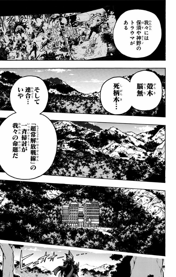 ついにヒーローによる一斉襲撃作戦が始まる。潜入から時間は掛かったが、全てはこの瞬間、確実に「超常解放戦線」を制圧するんだ! 子どもの頃から憧れていたヒーローみたいにみんなの為、俺は誰よりも速く飛んでいく! “Plus Ultra”!!