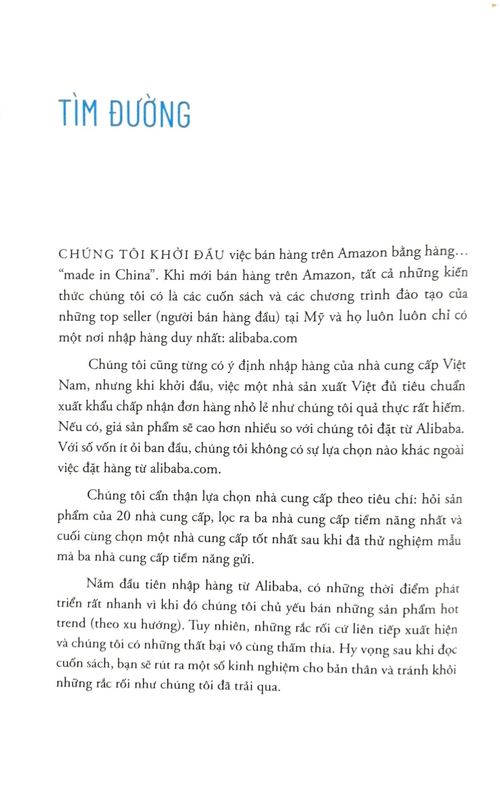 - Cuốn sách không chỉ đưa ra hướng dẫn chi tiết về cách thức kinh doanh trên Amazon mà các tác giả nhấn mạnh việc xây dựng một store, tìm kiếm sản phẩm phù hợp, nghiên cứu được khách hàng chiến lược đã quan trọng nhưng quan trọng hơn hết là cần xây dựng được thương hiệu. Thương hiệu sẽ trường tồn mãi theo thời gian. Các đoạn hay trong sách: Mọi thứ lúc này dường như sụp đổ với chúng tôi, dù thành công đã ở rất gần trước mắt. Tôi đã bị sốc và luôn cảm thấy chông chênh trong suốt ba tháng sau đó. Chúng tôi đã chuẩn bị rất kĩ Mọi thứ lúc này dường như sụp đổ với chúng tôi, dù thành công đã ở rất gần trước mắt. Tôi đã bị sốc và luôn cảm thấy chông chênh trong suốt ba tháng sau đó. Chúng tôi đã chuẩn bị rất kỹ, đã nghiên cứu phương pháp ra mắt sản phẩm thành công, đã đưa sản phẩm lên vị trí best seller trên Amazon vậy nhưng chỉ vì một sơ sót trong quá trình sản xuất mà phải trả giá đắt. Việc quá nôn nóng kiếm tiền khiến chúng tôi bỏ qua những biện pháp phòng vệ an toàn. Đây là một bài học vô cùng đáng giá. Đây là thất bại có tính bước ngoặt, nó khiến team đầu tiên của chúng tôi tan rã. Trong team lúc đó có một số anh chị làm xây dựng, làm ngân hàng, làm giáo dục đã không còn kiên nhẫn và bỏ cuộc, quay trở lại công việc trước kia. Chúng tôi hiểu và không đổ lỗi cho ai bởi vì mỗi người đều có lựa chọn riêng, có gia đình để chăm sóc và quyết định tạm dừng hoạt động sau đó một tháng có lẽ là điều đúng đắn nhất. Một tháng đó là thời gian tôi phải đấu tranh rất nhiều, giữa việc tiếp tục với giấc mơ khởi nghiệp dang dở hoặc quay trở lại công việc 8-5 (8 giờ/ngày và 5 ngày/ tuần). Trong khoảng thời gian chông chênh, tôi cứ mông lung nghĩ ngợi. Tôi đặt ra rất nhiều câu hỏi cho bản thân trong đó có một câu hỏi làm tôi suy nghĩ nhiều nhất: “Làm thế nào để một sản phẩm có thể bán lâu dài trên Amazon?”. Chính vào thời điểm đó, tôi đọc được một câu nói của Stephen King: “Một sản phẩm có thể lỗi thời nhanh chóng, nhưng một thương hiệu thành công sống mãi với thời gian”. Đó chính là vấn đề của chúng tôi. Chúng tôi mải mê đi tìm những sản phẩm hot trend, những sản phẩm hợp xu thế mà quên mất phải xây dựng cho mình một thương hiệu. Tôi chợt bừng tỉnh. Nghỉ việc văn phòng với ước mơ xây dựng những thương hiệu trên Amazon nhưng lại học theo những công thức tìm kiếm sản phẩm khô cứng để bán bất kỳ sản phẩm nào, kể cả những thứ chúng tôi không có am hiểu hoặc thậm chí chẳng có chút đam mê nào với nó.Tôi và Tony quyết định, vấp ngã ở đâu thì đứng dậy ở đó. Chúng tôi không có mong muốn gì hơn là Việt Nam sẽ trở thành một thế lực mới của thương mại điện tử xuyên biên giới, đặc biệt là trên Amazon. Điều đó sẽ giúp cho vị thế của hàng Việt Nam được người tiêu dùng tại Mỹ và thế giới ghi nhận, giúp cho doanh nghiệp Việt kinh doanh quốc tế sau này càng dễ dàng. Giống như Nhật Bản trước kia, khi một sản phẩm của họ thâm nhập được thị trường Mỹ, làn sóng hàng Nhật Bản vươn ra chiếm lĩnh thị trường Mỹ và thế giới càng lúc càng mạnh mẽ hơn. Để làm được điều đó, ngoài việc sản phẩm Việt phải có chất lượng tốt, mẫu mã đẹp chúng tôi tin rằng Việt Nam cũng phải học hỏi thêm những bài học thành công và thất bại của những các quốc gia khác đi trước như Nhật Bản, Hàn Quốc, Trung Quốc… để làm tốt hơn nữa. Năm 2019 chúng tôi tham gia “Amazon Sellers World Conference” – Hội thảo của những top Amazon sellers (người bán hàng trên Amazon) toàn thế giới tại Bangkok, Thái Lan. Chúng tôi rất ngạc nhiên khi gặp nhiều sellers hàng đầu thế giới, có doanh thu hàng triệu đô mỗi năm đang sinh sống và làm việc tại Sài Gòn. Ngoài việc là một thành phố năng động, cởi mở thì Sài Gòn còn là nơi tập trung rất nhiều cơ sở sản xuất, nhà máy xí nghiệp lớn của cả Việt Nam và quốc tế. Đó là thiên đường cho người bán hàng Amazon (sellers) tìm kiếm cơ hội và tìm kiếm nhà cung cấp tốt. Chúng tôi cũng mang theo một vài sản phẩm đặc trưng của Việt Nam như đồ gỗ trang trí, đồ thủ công, trà Việt để giới thiệu với bạn bè thế giới và bàn trưng bày của chúng tôi luôn được khách ghé thăm nhiều nhất trong số hơn 10 bàn trưng bày của Hội thảo hôm đó. Sau khi trở về từ sự kiện này, chúng tôi cũng nhận được nhiều đơn đặt hàng của các sellers từ Mỹ, Úc, Đức và nhiều lời đề nghị cùng hợp tác. Sellers thế giới đã và đang kinh doanh trên Amazon với sản phẩm Việt, tại chính đất nước chúng ta. Vậy tại sao chúng ta không tự tin phát triển sản phẩm Việt, xây dựng thương hiệu Việt trên Amazon cho chính bản thân mình? Với sự lớn mạnh không ngừng của mô hình bán hàng Amazon FBA tại Việt Nam trong vài năm qua, Amazon đã chú tâm nhiều hơn tới thị trường Vi