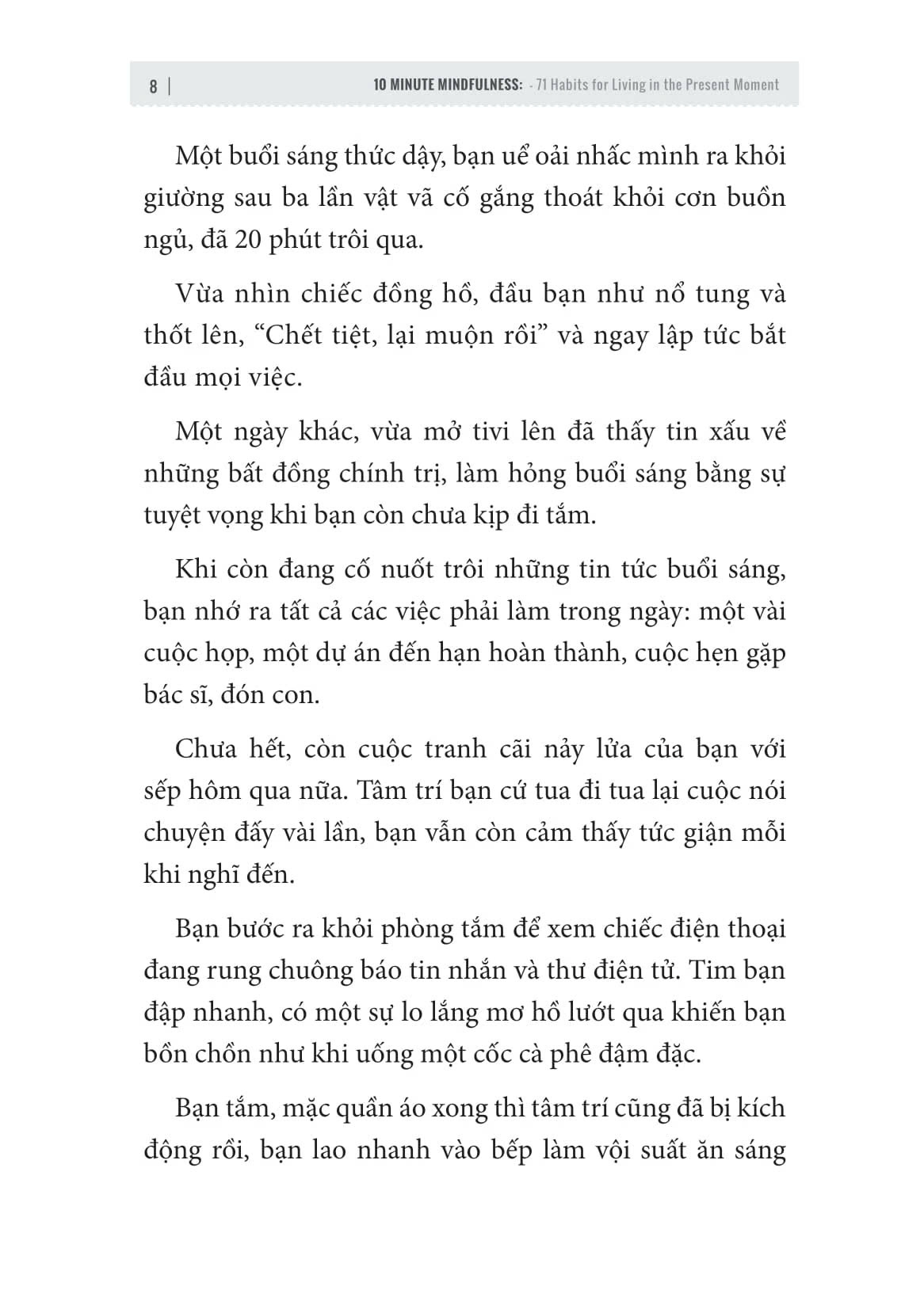 Mỗi buổi sáng thức dậy, bạn uể oải nhấc mình ra khỏi giường. Bạn nhớ ra tất cả các việc phải làm trong ngày: một vài cuộc họp, một dự án đến hạn hoàn thành, cuộc hẹn gặp bác sĩ, đón con.  Chưa hết, còn cuộc tranh cãi nảy lửa của bạn với sếp hôm qua nữa. Tâm trí bạn cứ tua đi tua lại cuộc nói chuyện đấy vài lần, bạn vẫn còn cảm thấy tức giận mỗi khi nghĩ đến. Bạn bước ra khỏi phòng tắm để xem chiếc điện thoại đang rung chuông báo tin nhắn và thư điện tử. Tim bạn đập nhanh, có một sự lo lắng mơ hồ lướt qua khiến bạn bồn chồn như khi uống một cốc cà phê đậm đặc.  Bạn lao nhanh vào bếp làm vội suất ăn sáng rồi rời khỏi nhà, trong khi con bạn cãi nhau tranh giành chiếc bánh rán cuối cùng và chồng bạn thì đang hoảng loạn vì không tìm thấy chìa khóa xe. Vậy là bất kỳ khi nào bạn bắt đầu một ngày mới, tâm trí của bạn đều bị rối loạn và sao lãng. Thế giới nội tâm trong bạn gầm lên như những cơn chấn động xảy ra trước khi núi lửa phun trào.  Bạn có thấy tình cảnh này khá quen thuộc không? Có lẽ tình cảnh đó không mô tả chính xác cuộc sống và thói quen hằng ngày của bạn, nhưng có lẽ bạn đã trải qua một số phiên bản của nó trước đó.  Sao lãng. Căng thẳng. Lo Lắng. Kích động. Suy nghĩ tiêu cực. Kiệt sức về thể chất và cảm xúc.  Tất cả những tác nhân đó đóng vai trò lớn hơn nhiều trong cuộc sống so với những gì ta thừa nhận. Phần lớn thời gian, chúng ta đều bắt đầu ngày mới theo một cách chẳng yên bình hay vui vẻ gì. Trên thực tế, hầu hết chúng ta đều cảm thấy xa cách với sự tĩnh lặng, tập trung, và ở thời điểm hiện tại, điều này gây tổn hại cho hạnh phúc và sức khỏe tinh thần của chúng ta. 10 phút tĩnh tâm – 71 thói quen cân bằng cuộc sống hiện đại để tránh cái bẫy của lối sống vô thức Những tình huống trên xuất phát từ vòng luẩn quẩn của các phản ứng, sự sao lãng và căng thẳng, thứ có thể được gọi là “lối sống vô thức”. Việc không ý thức về cách lựa chọn lối sống, thói quen và suy nghĩ gây ra cho hầu hết chúng ta sự bất hạnh và lo lắng.  Chúng ta không biết về giá trị thực sự, các ưu tiên của cuộc sống và khao khát để có được một lối sống cân bằng hơn. Chúng ta cũng không ý thức được về sự yên bình và hài lòng ngay hiện tại, bởi vì chúng ta cứ mãi bận tâm tới những hối tiếc và lo lắng trong quá khứ cũng như trong tương lai.  “10 phút tĩnh tâm” kéo bạn trở về thực tại Tĩnh tâm là bạn nhận thức một cách có chủ đích về hiện tại trong khi vẫn chú ý đến cảm xúc, suy nghĩ và cảm giác của cơ thể. Bạn chủ động tập trung và hướng nhận thức của bạn đến điều bạn đang làm hoặc đang suy nghĩ như khi rửa bát, nói chuyện với vợ/chồng, chơi với con, thực hiện một dự án hoặc khi không làm gì cả.  Đối với những người thường xuyên bị cuốn theo các mối bận tâm trong cuộc sống thường ngày, tĩnh tâm giúp họ trân trọng từng giây phút và có được một tầm nhìn lớn hơn về cuộc sống. Nó cũng giúp chúng ta thay đổi các phản ứng theo thói quen bằng cách dừng lại đủ lâu để ta lựa chọn cách hành động. Những lợi ích của tĩnh tâm được chia thành ba loại: