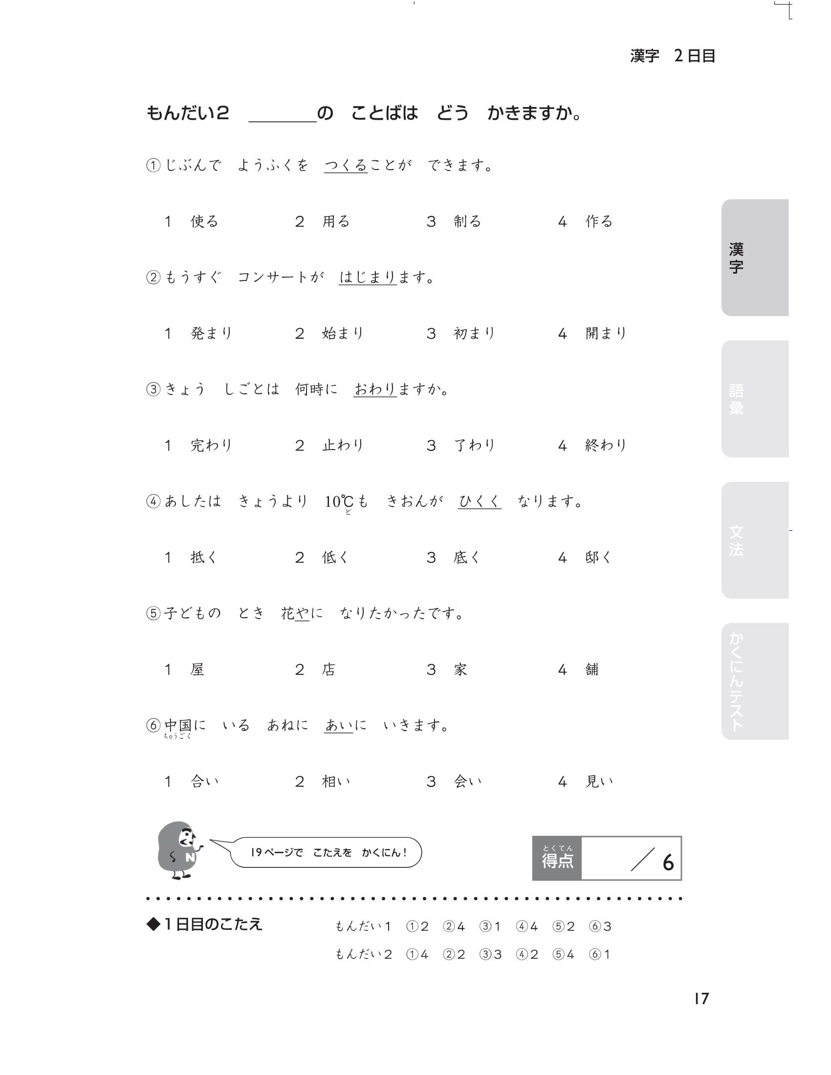 Cuối cùng, có 5 bài thi thử (tổng cộng 40 câu hỏi) mô phỏng đề thi năng lực tiếng Nhật. Thử thách bản thân ngay trước kỳ thi bằng cách xem lại nhiều lần những chỗ mình đã sai ( thứ tự các phần trong đề thi chính thức là chữ Hán, từ vựng và cuối cùng là ngữ pháp) bạn nhé. Hãy sử dụng cuốn sách này một cách hiệu quả Chúng tôi đã chuẩn bị rất nhiều câu hỏi để các bạn có thể luyện tập trong 15 ngày theo thứ tự các phần: chữ Hán, từ vựng, ngữ pháp. Hơn nữa, thông qua bảng checklist bạn có thể dễ dàng phân bổ số lượng câu hỏi nên làm trong một ngày và sắp xếp kế hoạch học tập cho đến thời điểm thi sao cho phù hợp.