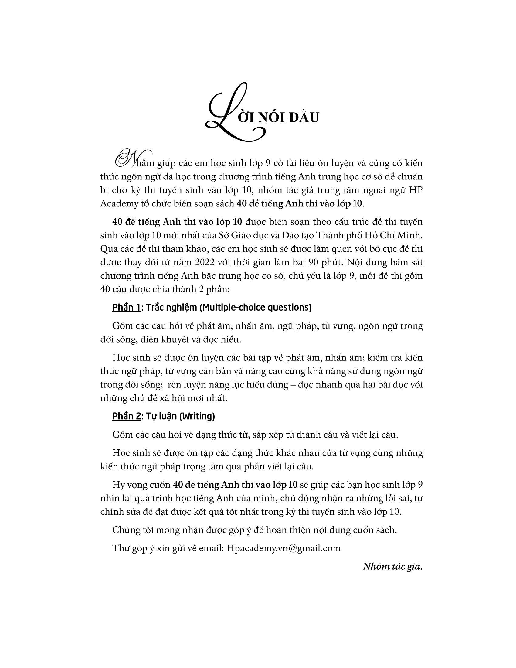 Nhằm giúp các em học sinh lớp 9 có tài liệu ôn luyện và củng cố kiến thức ngôn ngữ đã học trong chương trình tiếng Anh trung học cơ sở để chuẩn bị cho kỳ thi tuyển sinh vào lớp 10, nhóm tác giả trung tâm ngoại ngữ HP Academy tổ chức biên soạn sách 40 đề tiếng Anh thi vào lớp 10.