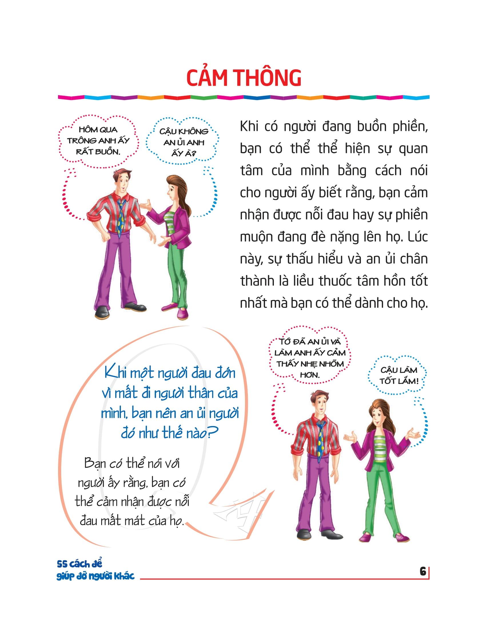 Cuốn sách này đưa ra cho bạn 55 gợi ý để bạn có thể giúp đỡ những người xung quanh và giúp bạn mang lại cảm giác vui vẻ, hạnh phúc cho mọi người. Chắc chắn bạn sẽ thích cảm giác được mọi người trân trọng sau khi giúp cho cuộc sống của họ trở nên tốt đẹp hơn. Bạn sẽ cảm thấy thế giới xung quanh tuyệt vời biết bao nhiêu, và bạn sẽ có động lực để tiếp tục thực hiện những nghĩa cử cao đẹp đó. Khi làm được nhiều việc tốt, bạn sẽ củng cố được niềm tin và sự gắn kết của bạn với mọi người.