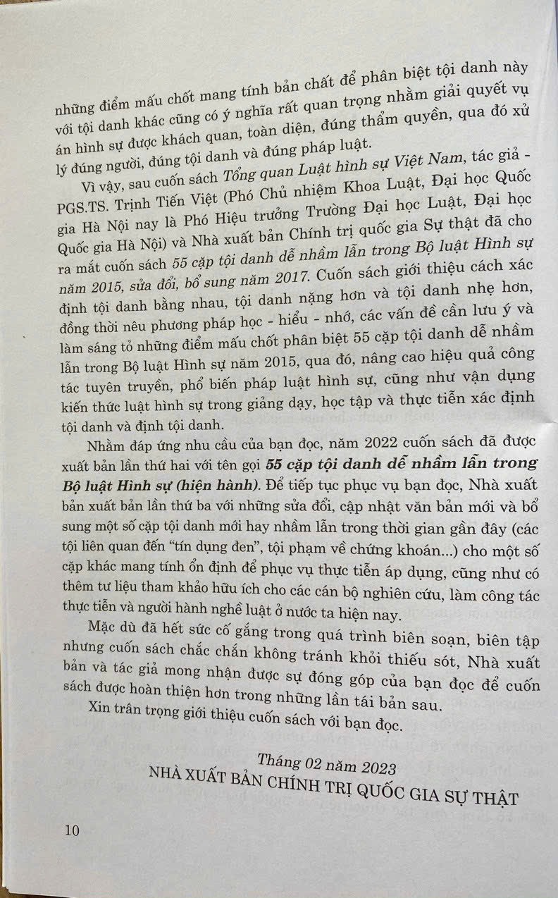 Sau cuốn sách Tổng quan Luật hình sự Việt Nam, tác giả – PGS.TS. Trịnh Tiến Việt (Phó Chủ nhiệm Khoa Luật, Đại học Quốc gia Hà Nội nay là Phó Hiệu trưởng Trường Đại học Luật, Đại học Quốc gia Hà Nội) và Nhà xuất bản Chính trị quốc gia Sự thật đã cho ra mắt cuốn sách 55 cặp tội danh dễ nhầm lẫn trong Bộ luật Hình sự năm 2015, sửa đổi, bổ sung năm 2017. Cuốn sách giới thiệu cách xác định tội danh bằng nhau, tội danh nặng hơn và tội danh nhẹ hơn, đồng thời nêu phương pháp học - hiểu - nhớ, các vấn đề cần lưu ý và làm sáng tỏ những điểm mấu chốt phân biệt 55 cặp tội danh dễ nhầm lẫn trong Bộ luật Hình sự năm 2015, qua đó, nâng cao hiệu quả công tác tuyên truyền, phổ biến pháp luật hình sự, cũng như vận dụng kiến thức luật hình sự trong giảng dạy, học tập và thực tiễn xác định tội danh và định tội danh.