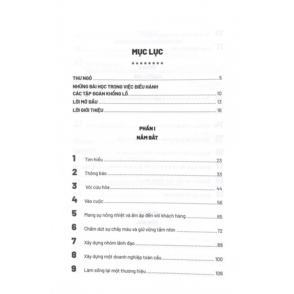 Cuốn sách được chia thành 5 phần: “Túm lấy lỗ hổng”, “Chiến lược”, “Văn hóa”, “Bài học” và “Quan sát”.
