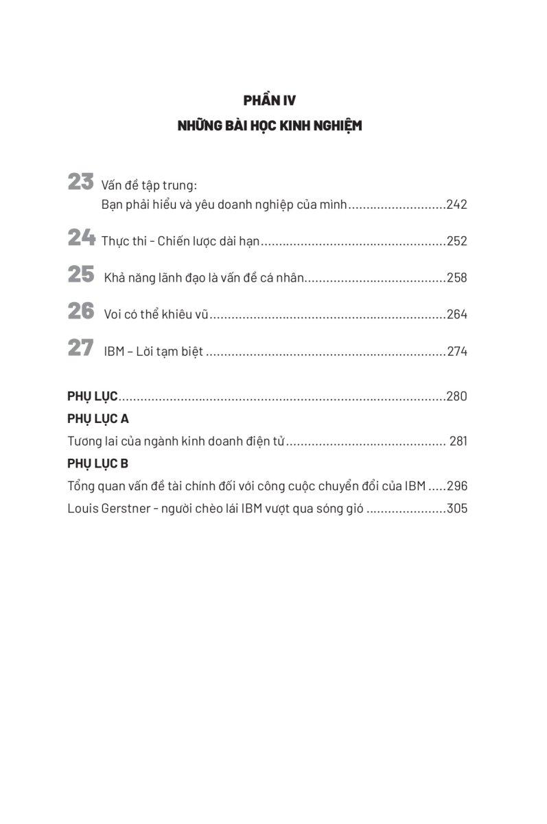 Cuối cùng Gerstner đề cập đến các bài học ông học được từ nhiệm kỳ của mình tại IBM. Ông nhấn mạnh vào trọng tâm của tổ chức, tin tức tốt, chiến lược chi tiết, thực hiện chuyên dụng, hiệu lực thi hành, kiểm tra, hiệu suất cao và lãnh đạo có tính thẩm quyền toàn vẹn gồm đam mê, kỷ luật và các tiêu chí cho sự thành công của một tổ chức.