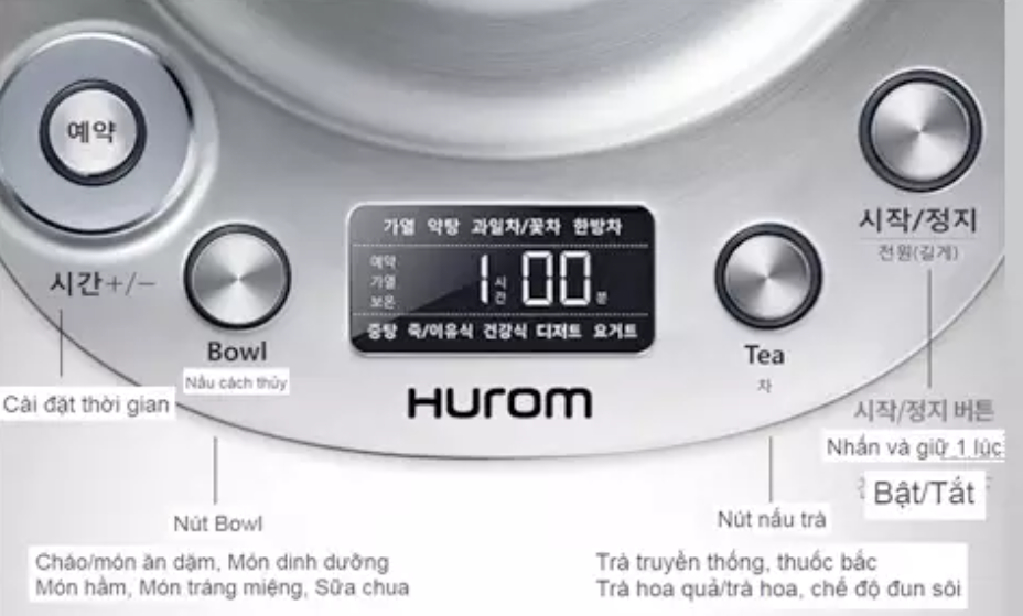 Hurom Tea Master là máy đa chức năng vừa là ấm đun nước siêu tốc, vừa là máy nấu các loại trà, nấm linh chi, sâm, thảo dược, vừa lại là máy chưng yên, nấm cháo, hầm các loại thức ăn giàu dinh dưỡng như bào ngư. Lại còn có thể làm các món tráng miệng như sữa chua. Đặc biệt có thể cùng 1 lúc nấu được 2 món khi dùng bolw thủy tinh.