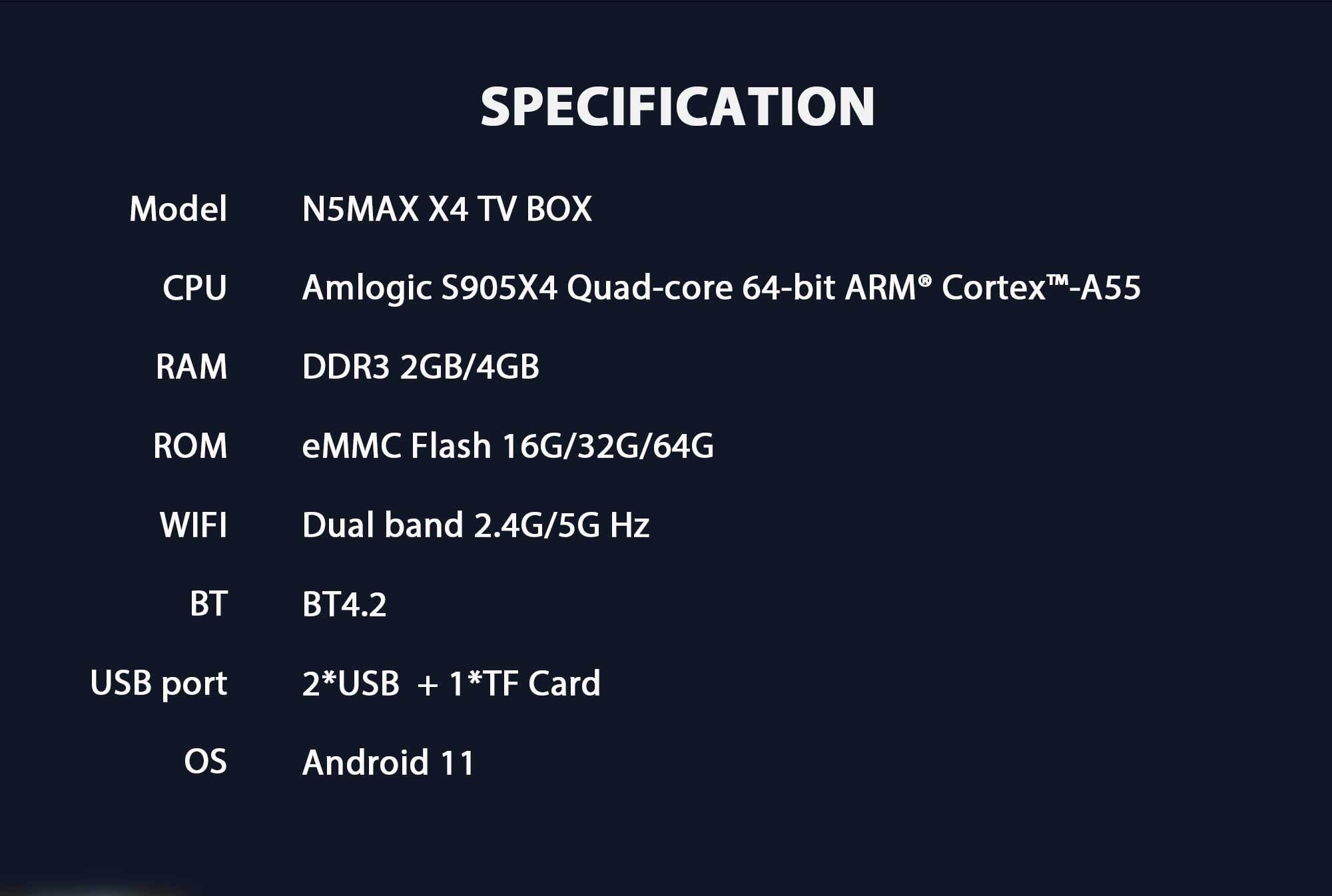 - Có thể cắm Amply , Hát Karaoke, Thay thế đầu PS kết nối loa không dây Thiết bị n5 max x4 xem phim Full HD cõ hỗ trợ xem phim 4K cho các dòng TV cao cấp n5 max x4 được thiết kế không khác gì một chiếc điện thoại cao cấp ngoại trừ tính năng nge và gọi. Các bạn có thể vào mạng, lướt web, xem phim, xem bóng đá, đọc tin tức. Thiết bị android TV n5 max x4 sẽ thay thế và bổ trợ cho các dòng TV đã là Smart Tv hoặc chỉ là TV thông thường. Đặc biết các bạn có thể thoải mái truy cập vào kho ứng dụng CH PAY của Google tải bất kỳ ứng dụng nào muốn vè TV nhà bạn. Google tải bất kỳ ứng dụng nào muốn vè TV nhà bạn. Amlogic S905X4 Amlogic S905X4 áp dụng bộ xử lý lõi tứ Cortex-A55, nó là "bộ xử lý ứng dụng tiên tiến được thiết kế cho các n5 max x4 OTT / IP Set-Top Box (STB) cao cấp. Các lõi Cortex-A55 cung cấp tới hai lần hiệu suất so với Cortex-A53 về điểm chuẩn bộ nhớ và cải thiện hiệu suất 20 đến 30% điển hình hơn cho các tác vụ thông thường ở cùng tần số. Hệ điều hành Android 11 Nó dựa trên hệ điều hành Android 11 mới nhất, với tốc độ cao và hiệu năng mượt mà, được thiết kế để biến TV thông thường của bạn thành một tivi thông minh. Độ phân giải 8K UHD Độ phân giải hình ảnh thật 8k có thể lên tới 7680 4320 để đạt được độ chính xác gấp 16 lần hình ảnh 1080p. USB 3.0 Tốc độ đọc / ghi cao. USB 3.0 có tốc độ tối đa 5 gigabit mỗi giây, về mặt lý thuyết nhanh hơn mười lần so với USB 2.0. WiFi băng tần kép 2.4G / 5G Với sự hỗ trợ cho băng tần 2.4Ghz và 5Ghz, nó có thể truyền lượng dữ liệu cao hơn. Thiết bị xem phim Full HD cõ hỗ trợ xem phim 4K cho các dòng TV cao cấp n5 max x4 được thiết kế không khác gì một chiếc điện thoại cao cấp ngoại trừ tính năng nge và gọi. Các bạn có thể vào mạng, lướt web, xem phim, xem bóng đá, đọc tin tức. Thiết bị n5 max x4 sẽ thay thế và bổ trợ cho các dòng TV đã là Smart Tv hoặc chỉ là TV thông thường. Đặc biết các bạn có thể thoải mái truy cập vào kho ứng dụng CH PAY của Google tải bất kỳ ứng dụng nào muốn vè TV nhà bạn. Google tải bất kỳ ứng dụng nào muốn vè TV nhà bạn. TẤT CẢ ĐÃ CÓ TRONG THIẾT BỊ ANDROID TV Về mặt trước nổi bật trên mặt sản phẩm là Logo Magicsee N5 max X4 được in nổi chính là điểm ấn tượng đầu tiên Sản phẩm có thiết kế nhỏ gọn với chiều ngang 10.5, chiều dài 10.5, chiều cao 2.8cm . android tivi box cũng chạy trên Android 11 Như đã thấy, ở mặt sau vẫn là cách bố trí các cổng kết nối quen thuộc, bao gồm 2 cổng USB ,1 khe thẻ, 1x AV, 1 cổng HDMI, cổng mạng JR45 và một cổng nguồn DC 5V-2A, cổng âm thanh số n5 max x4 hiện đang là sản phẩm được ưu chuộng trên thị trường không những bởi hiệu suất tuyệt vời của nó mà con do thiết kế . Với thiết kế mang phong cách cách của 1 siêu phẩm sản phẩm chỉ nhỏ gọn bằng 1 chiếc smart phone mang đến sự hiện đại và sang trang cho ngôi nhà bạn. CPU : Amlogic S905X4 64-bit Quad Core ARM Cortex A55 CPU GPU : G31 MP2 Bộ xử lý GPU Bộ nhớ LPDDR4: 4GB Rom: 32GB Wifi :IEEE 802.11 A/B/g/n/AC; 2.4G / 5G Hệ điều hành : Android 11 Bluetooth 1 HDMI,HD 2.1, Hỗ Trợ HD CEC, HDR và và 8K x 4K @ 24 Độ phân giải đầu ra 1 AV OUT 480i/576i tiêu chuẩn đầu ra độ nét 3 USB 1 USB 3.0 ; 2 USB 2.0 1 * Giao Diện Ethernet; Hỗ Trợ 10/100M