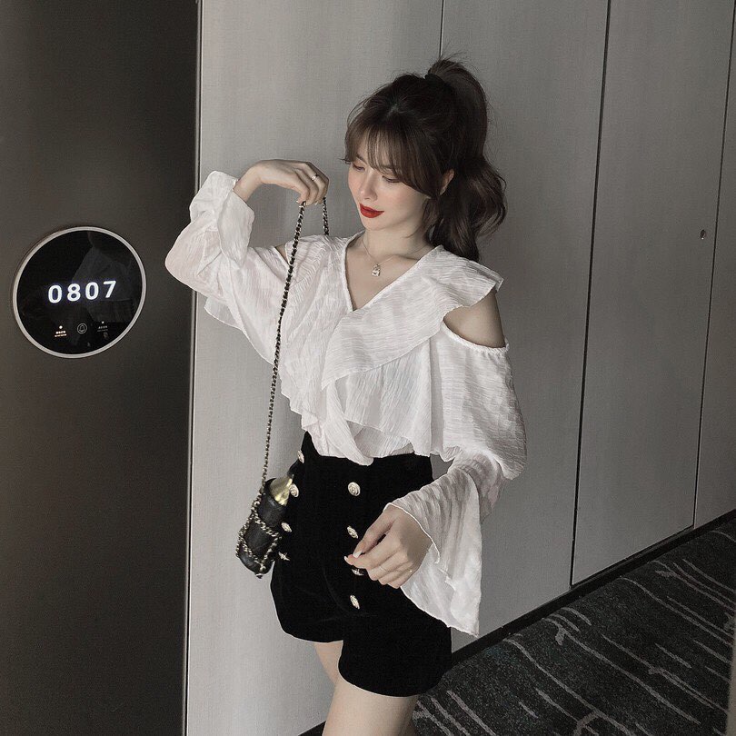 ✨Áo sơ mi nữ thời trang dài tay hở vai nhún bèo - Hàng cao cấp
