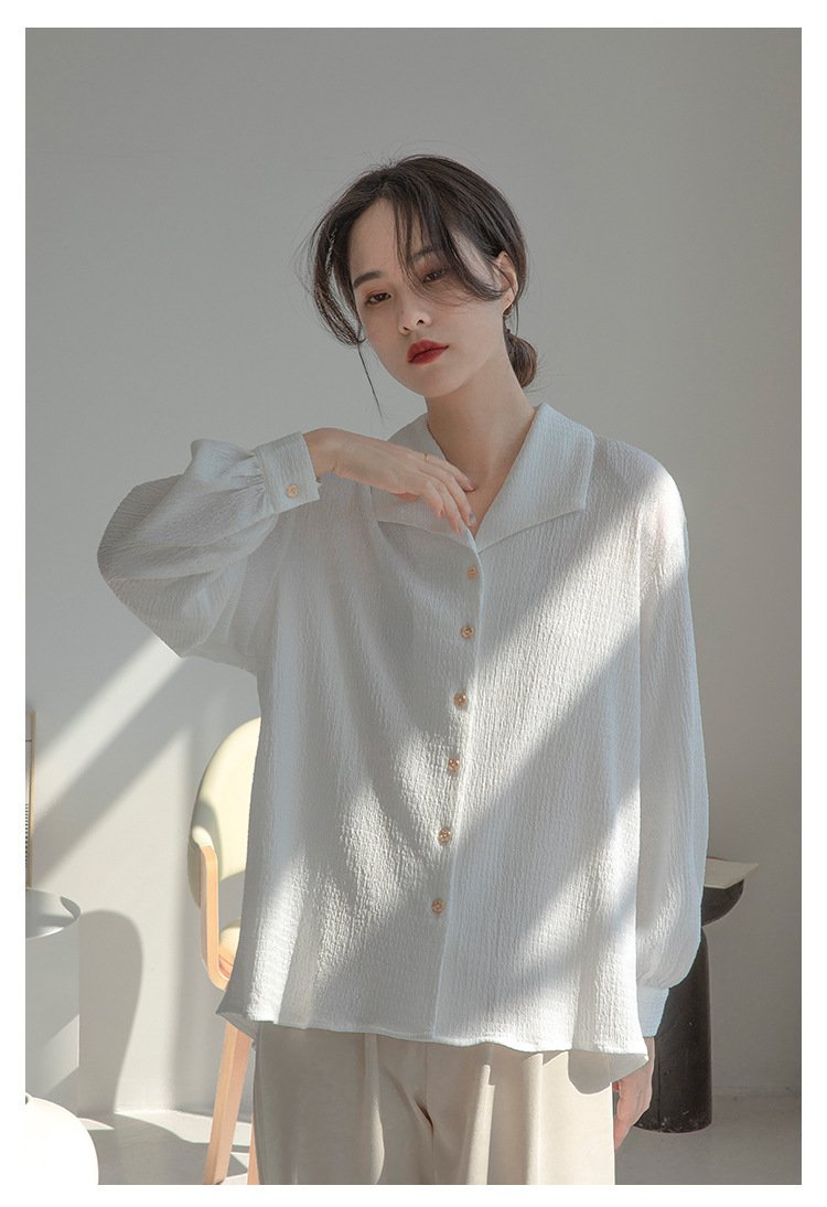 - Áo sơ mi nữ dài tay form rộng dài chùm mông, kiểu cổ áo bản to lạ mắt tạo kiểu.