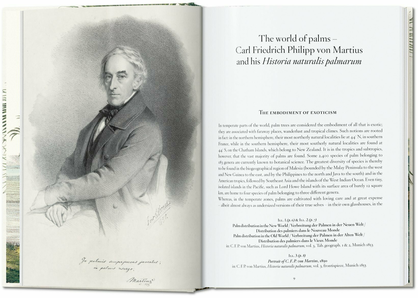 Kho tài liệu bách khoa gồm 240 hình minh họa màu sắc tinh tế này dựa trên các chuyến thám hiểm của von Martius qua Brazil và Peru. Kết quả là một danh mục vô song về tất cả các chi đã biết của họ cọ, phác thảo cách phân loại hiện đại của các loài cọ, mô tả tất cả các loài cọ của Brazil, và tạo ra các bản đồ địa lý sinh học cọ đầu tiên. Lá cây của Von Martius khác thường khi nó bao gồm các sơ đồ mặt cắt ngang, truyền đạt kiến trúc của những cái cây hùng vĩ này, điều mà người dân Trung Âu khó có thể hình dung chính xác. Đáng chú ý không kém là các cảnh quan màu sắc thể hiện các loài cọ khác nhau - thường đứng riêng lẻ với vẻ đẹp đơn giản và thanh lịch.