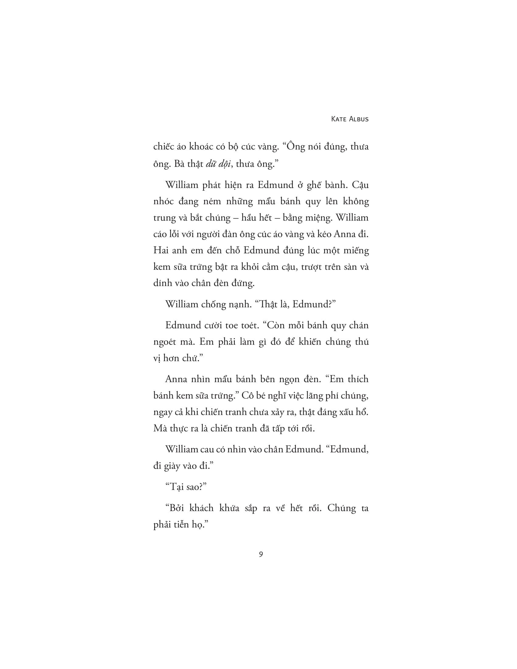 KATE ALBUS là nhà văn người Mỹ. Cô có niềm say mê với việc viết tiểu thuyết hư cấu có yếu tố lịch sử. Ba đứa trẻ và người thủ thư tốt bụng là tiểu thuyết đầu tay của cô, lấy bối cảnh nước Anh những ngày đầu của Thế chiến II. Câu chuyện được truyền cảm hứng từ niềm ham thích tìm hiểu về các cuộc di tản trong cuộc chiến tranh đầy đau thương này.