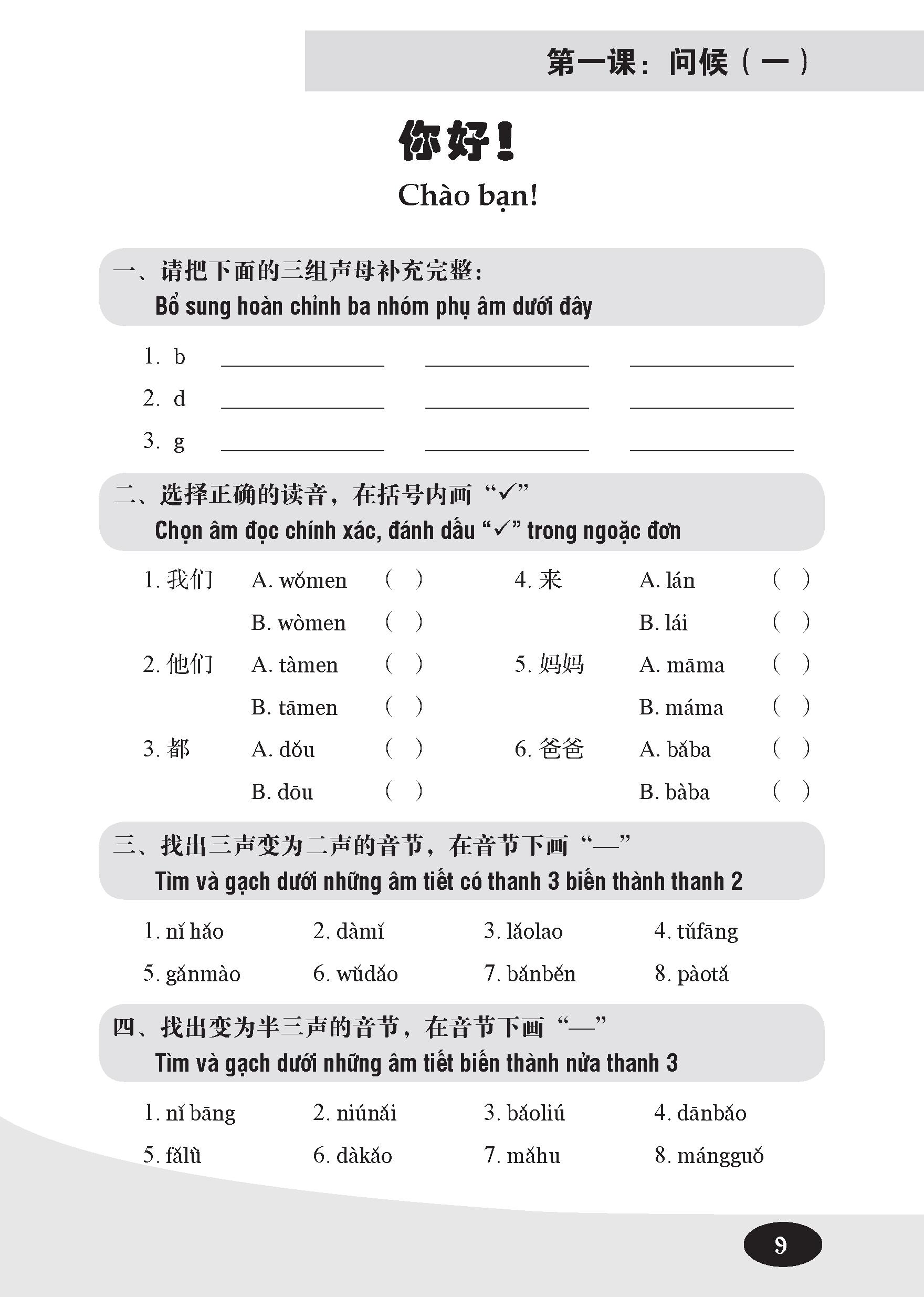 Giáo trình tiếng Trung Giao tiếp tổng hợp dành cho người Việt Nam Cuốn sách Giáo Trình Tiếng Trung Giao Tiếp Tổng Hợp Dành Cho Người Việt Nam có 15 bài, mỗi bài gồm: