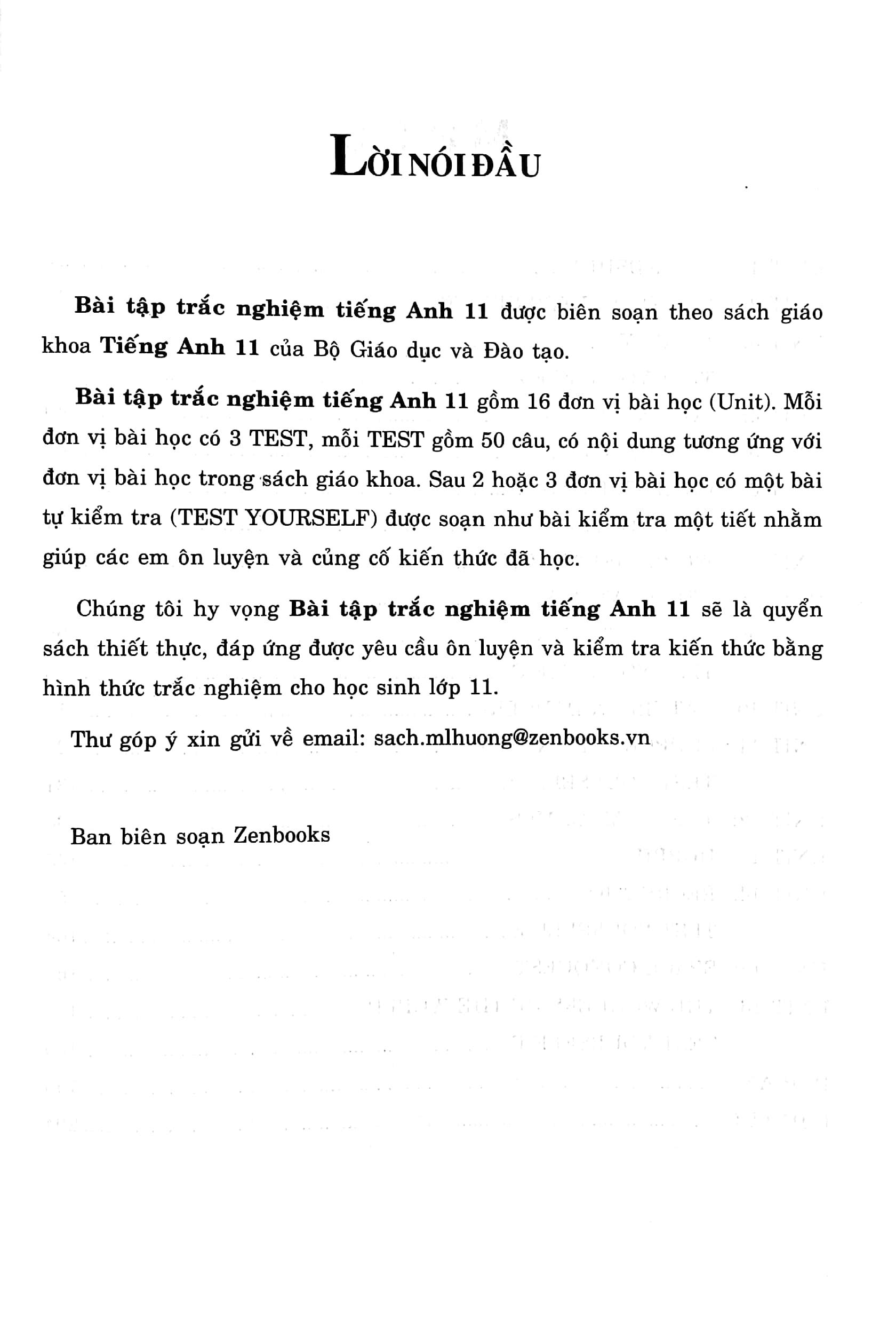 Chúng tôi hi vọng Bài Tập Trắc Nghiệm Tiếng Anh 11 sẽ là quyển sách thiết thực, đáp ứng được yêu cầu ôn luyện và kiểm tra kiến thức bằng hình thức trắc nghiệm cho học sinh lớp 11.