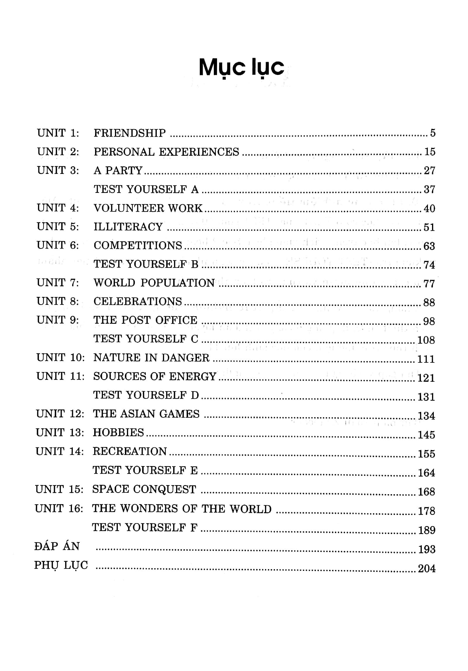 Bài Tập Trắc Nghiệm Tiếng Anh 11 gồm 16 đơn vị bài học. Mỗi đơn vị bài học có 3 Test, mỗi Test gồm 50 câu, có nội dung tương ứng với đơn vị bài học trong sách giáo khoa. Sau 2 hoặc 3 đơn vị bài học có một bài tự kiểm tra (Test Yourself) được soạn như bài kiểm tra một tiết nhằm giúp các em ôn luyện và củng cố kiến thức đã học.