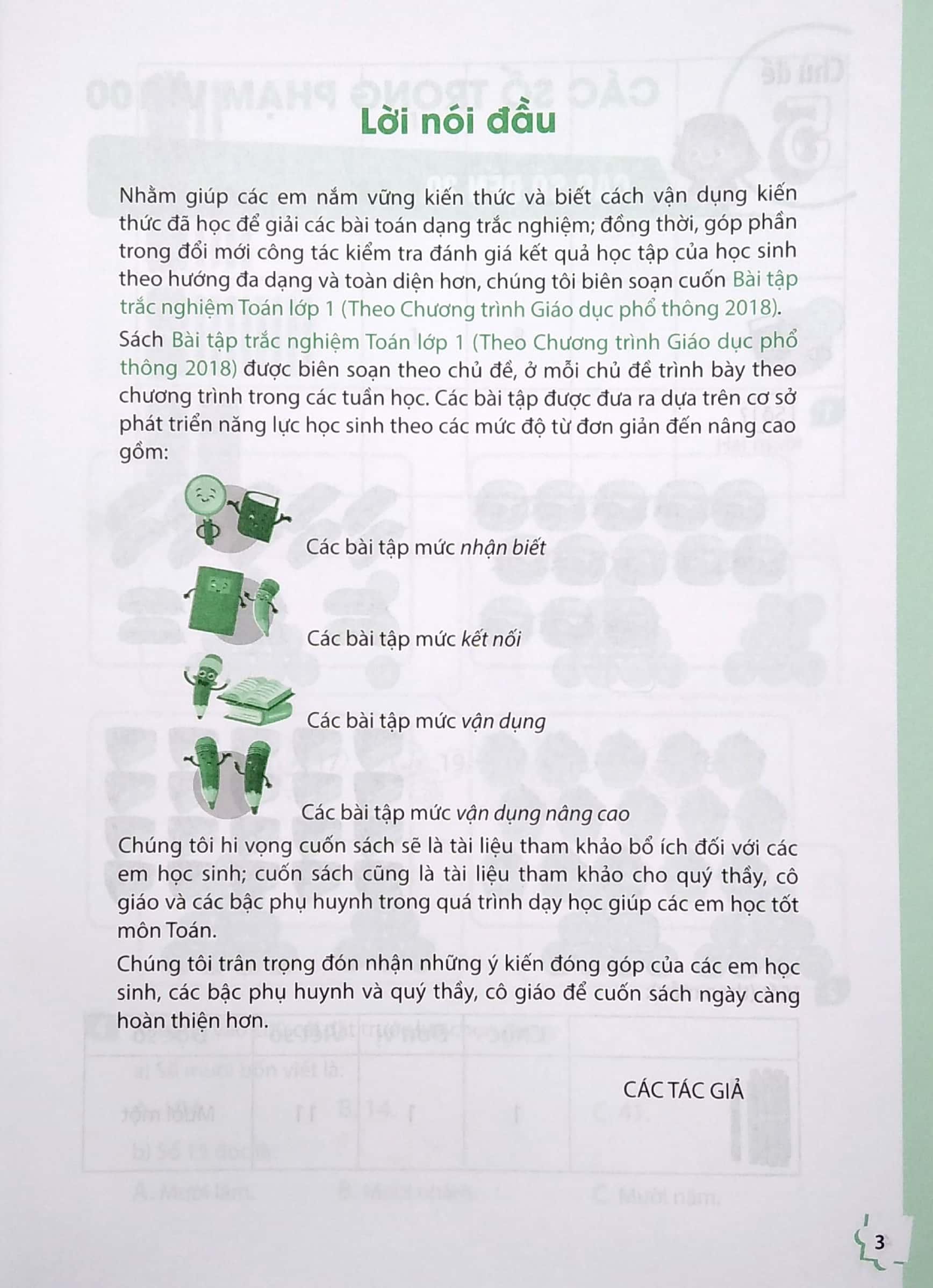 Nhằm giúp các em nắm vững kiến thức và biết cách vận dụng kiến thức đã học để giải các bài toán dạng trắc nghiệm; đồng thời, góp phần trong đổi mới công tác kiểm tra đánh giá kết quả học tập của học sinh theo hướng đa dạng và toàn diện hơn, chúng tôi biên soạn cuốn Bài tập trắc nghiệm Toán lớp 1 (Theo Chương trình Giáo dục phổ thông 2018).
