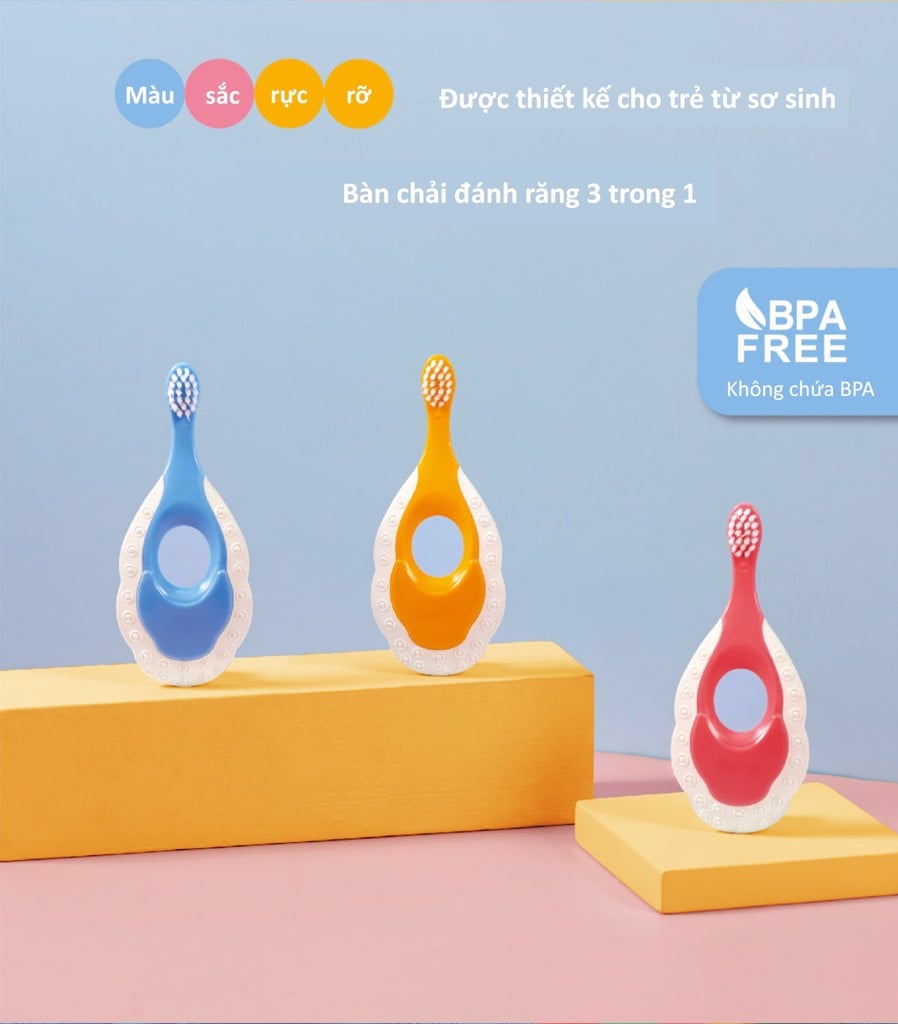 - Bàn chải có 3 màu: Xanh, vàng và hồng dễ thương cho bé lựa chọn.