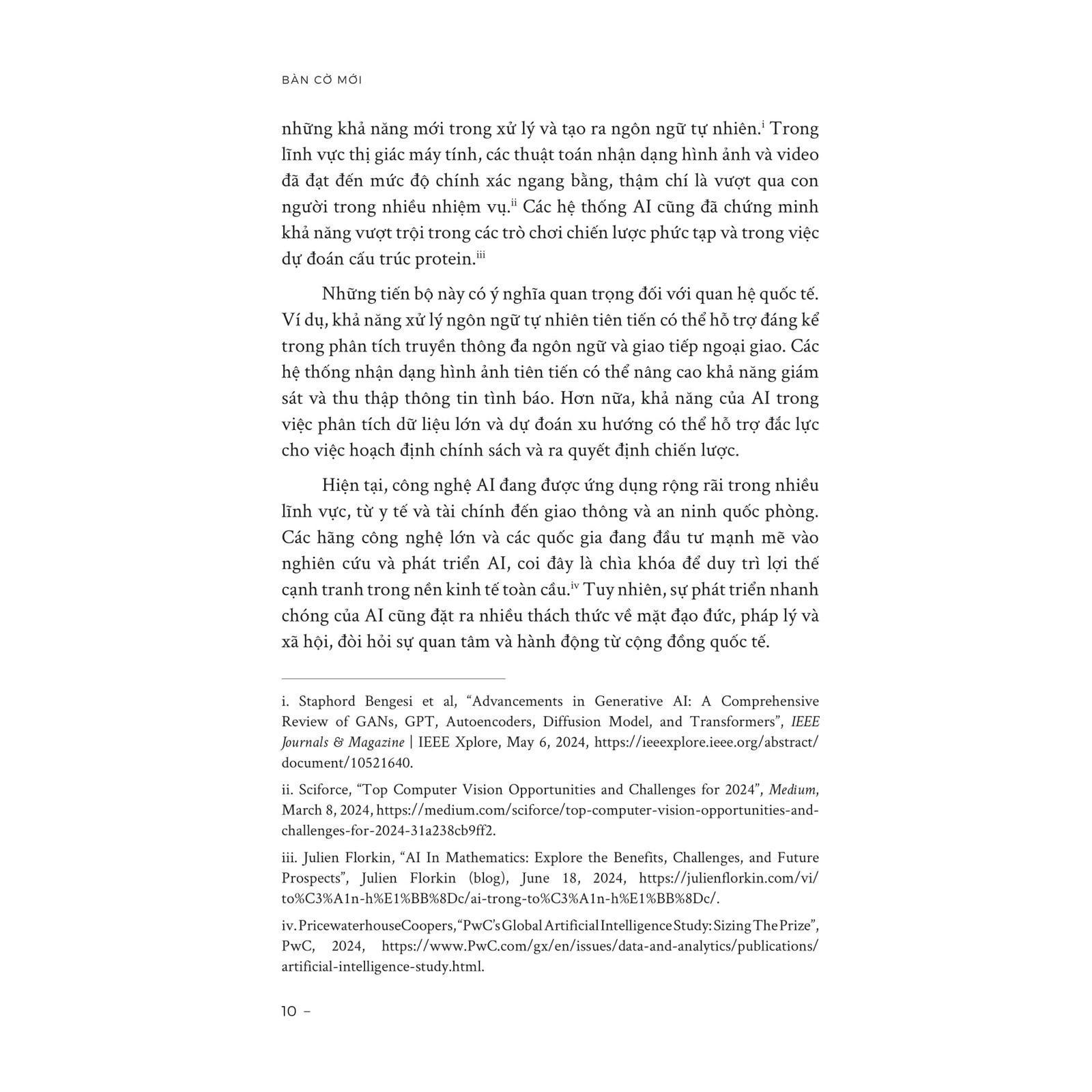 Qua 10 bài viết của 10 tác giả về nhiều chủ đề đa dạng, “Bàn cờ mới” sẽ dẫn dắt người đọc khám phá nhiều khía cạnh khác nhau của mối quan hệ phức tạp giữa AI và quan hệ quốc tế. Bắt đầu bằng việc phân tích tác động tổng thể của AI đối với môi trường đối ngoại và cấu trúc quyền lực toàn cầu, sau đó đi sâu vào vai trò của AI trong cạnh tranh giữa các cường quốc, cũng như ảnh hưởng của nó đối với tương lai của xung đột vũ trang.