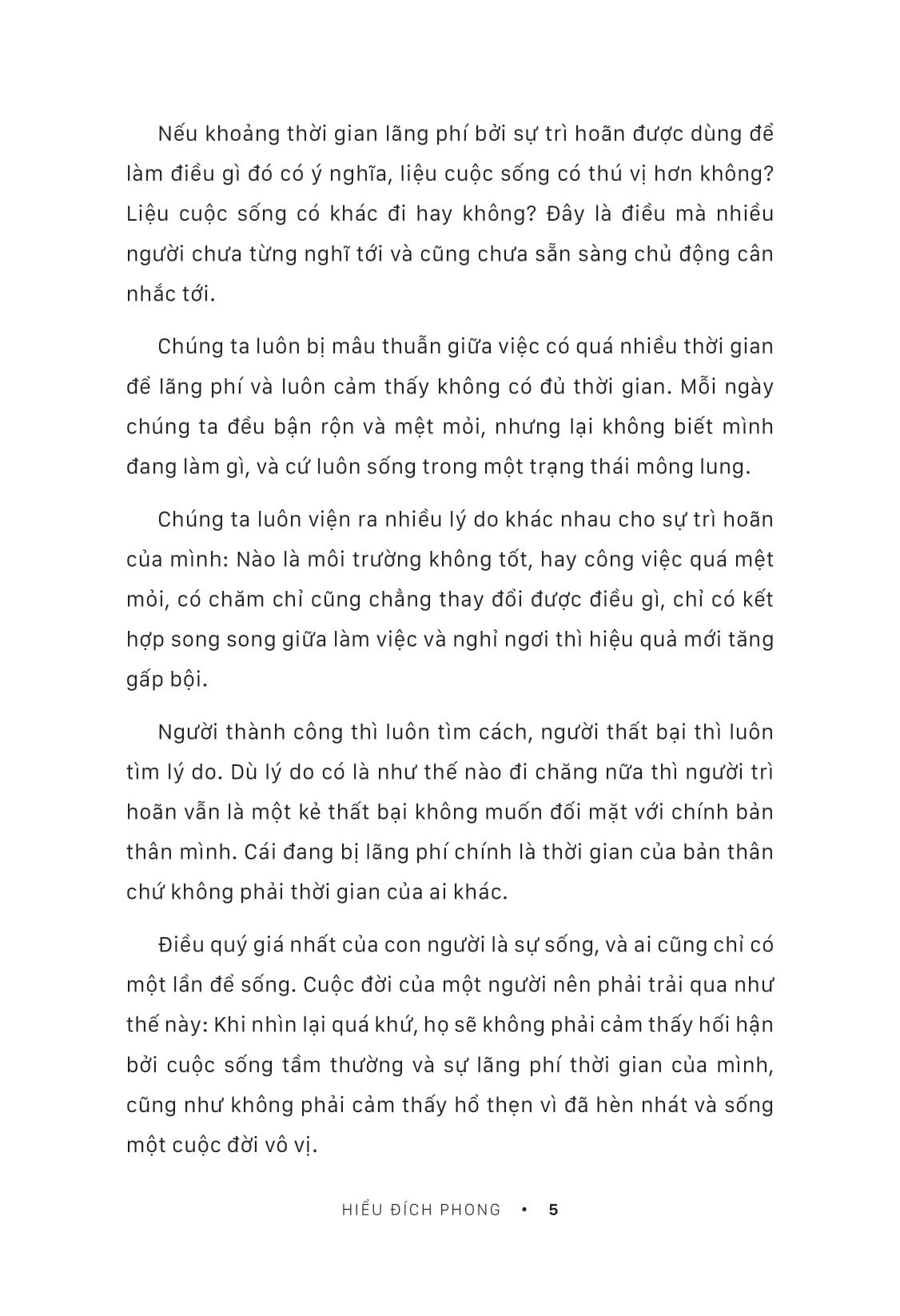 Bạn có từng cảm thấy dường như m.ình sở hữu thời gian vô biên nhưng lại không đủ thời gian cho mọi việc, luôn bận rộn và mệt mỏi nhưng hiếm khi biết rõ m.ình đang làm gì, cứ thế mông lung tiến về tương lai? Bạn đã từng thử thách bản thân hoàn thành công việc sát hạn chót để rồi tự hào rằng "áp lực tạo ra kim cương", m.ình đã lầy lội thế rồi mà vẫn xong việc, m.ình phải giỏi lắm thì mới gấp rút được như thế? Nếu gặp triệu chứng trên, hẳn là bạn đã mắc phải căn bệnh trì hoãn rồi.