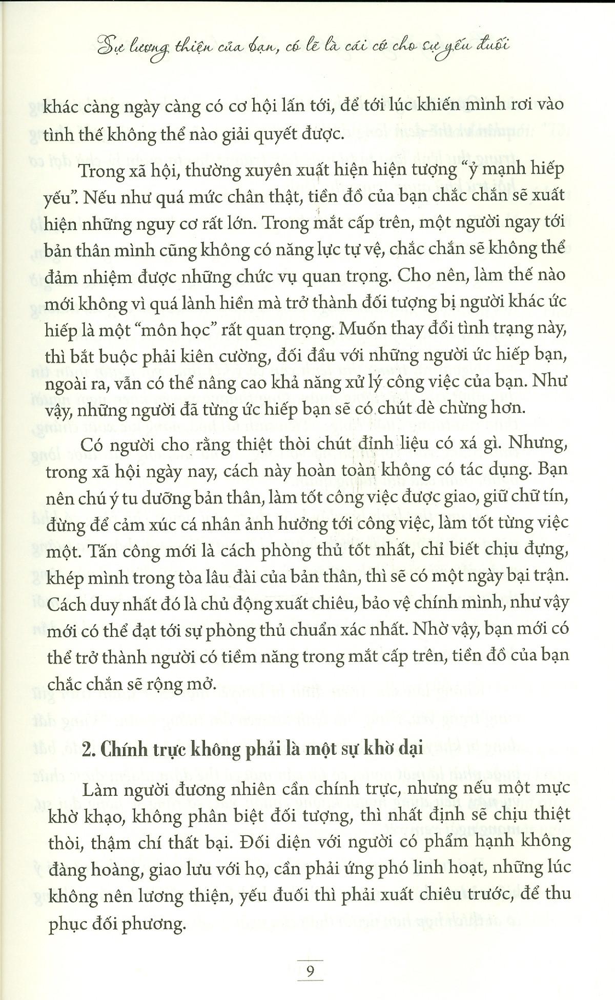 Bạn Hãy Sống Lương Thiện, Nhưng Phải Có Nguyên Tắc Trong xã hội hiện đại biến đổi khôn lường, cạnh tranh khốc liệt, người lương thiện nên làm gì để thay đổi hiện trạng cuộc sống của mình và xây dựng một cuộc đời hạnh phúc đây? Đó chính là sự lương thiện của bạn cần phài có nguyên tắc, cần phải có thái độ hài hòa, linh hoạt, tích cực trong công việc và ứng xử. Bạn lương thiện nhưng vẫn phải mạnh mẽ, học cách bảo vệ bản thân, biết cách giành lấy cơ hội thành công. Người lương thiện chắc chắn có thể tạo nên một cuộc sống xuất sắc, vẫn có được hạnh phúc của riêng mình.
