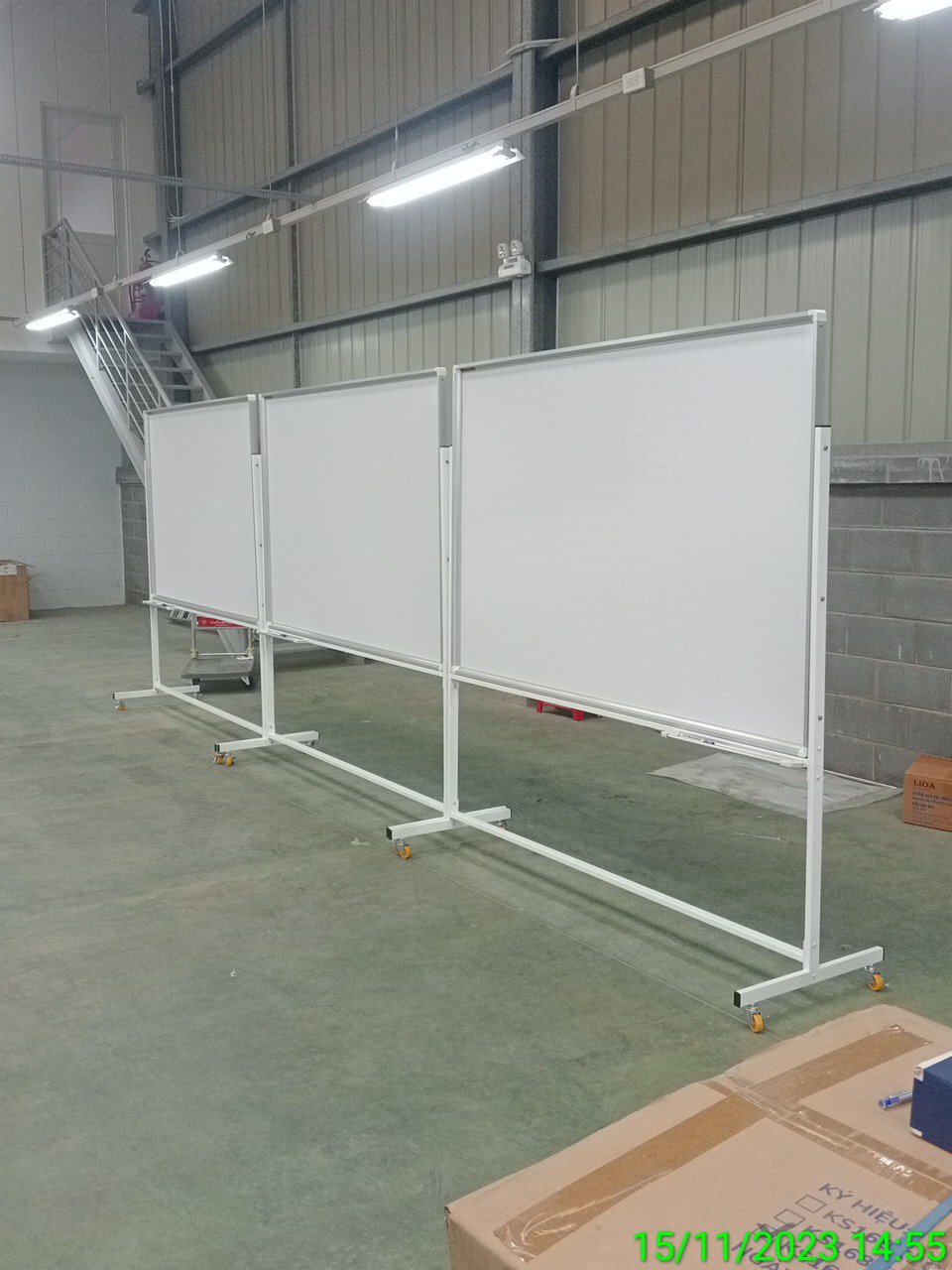 Bảng có 2 mặt, kích thước mặt bảng là 1.2x2.4m Cấu tạo sản phẩm: BẢNG: – Mặt bảng: Màu trắng dùng để viết bút lông, được nhập khẩu từ Đài Loan, viết lau dễ dàng,