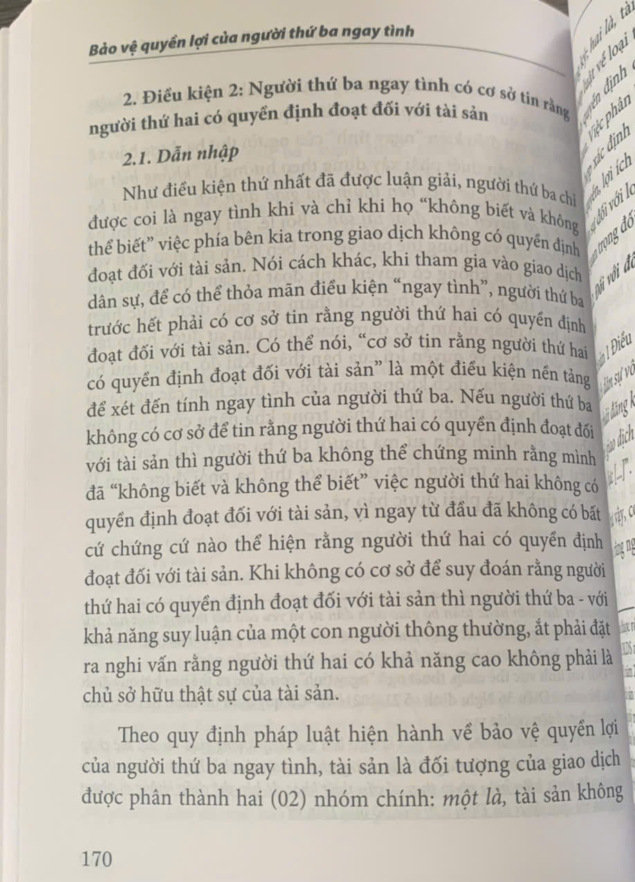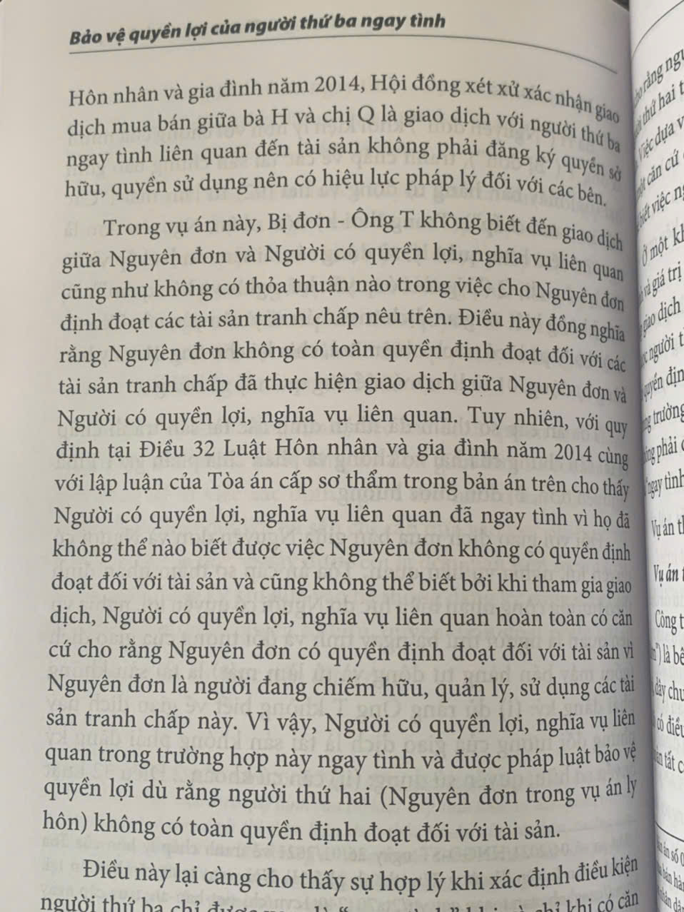 Do đó, việc thể một số trường hợp còn chưa thống nhất. Do đó, việc tiếp tục nghiên cứu lý luận và thực tiễn của các khía cạnh pháp lý về bảo vệ quyền lợi của người thứ ba ngay tình là hết sức cần thiết, không chỉ cho người nghiên cứu, người học luật mà cả những người làm thực tiễn, như Thẩm phán, Luật sư, Công tố viên, Điều tra viên... và những người tham gia xây dựng chính sách, pháp luật.