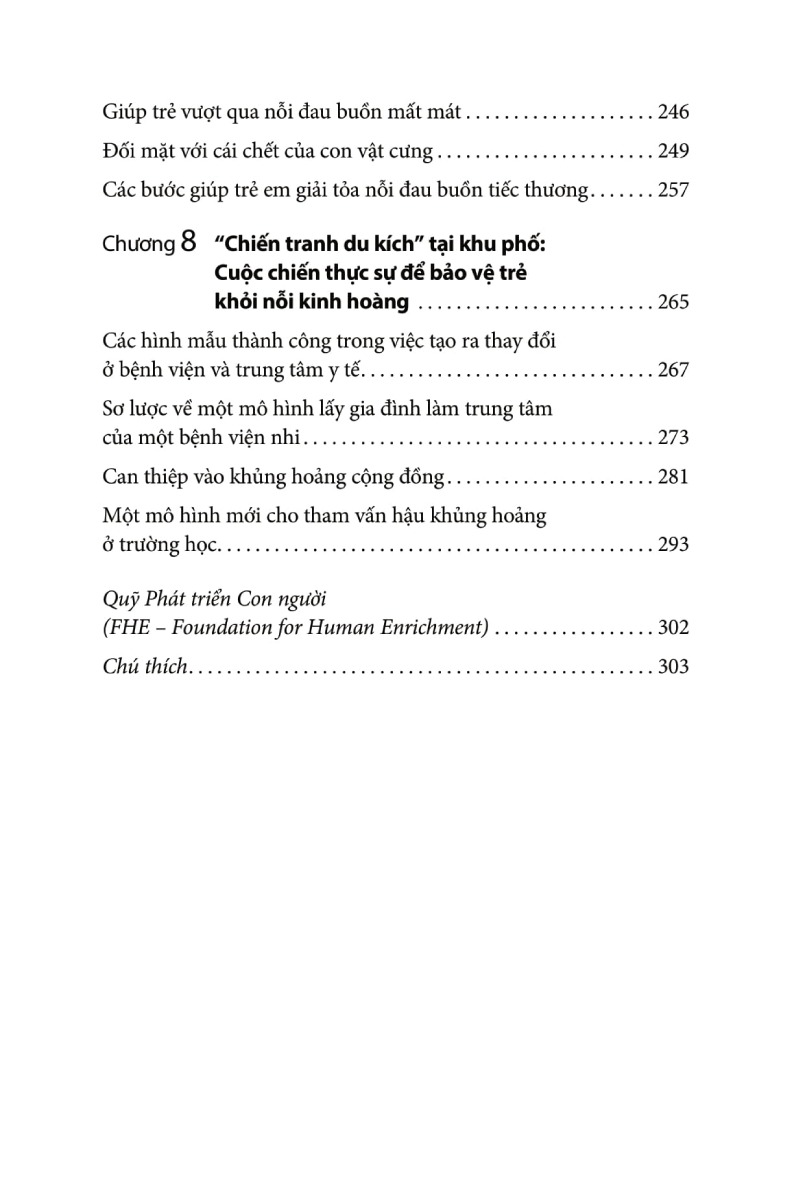 Không tự giới hạn trong những cách khắc phục chấn thương ngay từ đầu với những phương pháp sơ cứu cảm xúc hay phòng ngừa từ những dấu hiệu xuất hiện sớm nhất, “Bảo vệ trẻ trước chấn thương tâm lý” còn hướng dẫn và mô tả các bước trị liệu cho trẻ từng bị chấn thương từ nhiều năm mà nay biểu hiện qua các triệu chứng như lo âu hay trầm cảm.