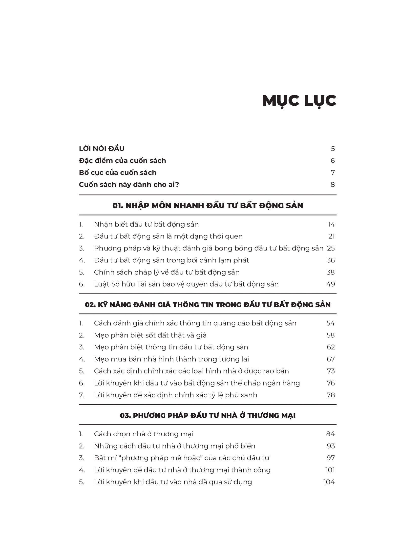 - Cuốn sách trình bày một cách chi tiết các loại hình đầu tư bất động sản hiện nay, mỗi loại hình đều chỉ rõ ưu, nhược điểm, các phương pháp đầu tư, các cạm bẫy cần tránh cho nhà đầu tư mới gia nhập thị trường.