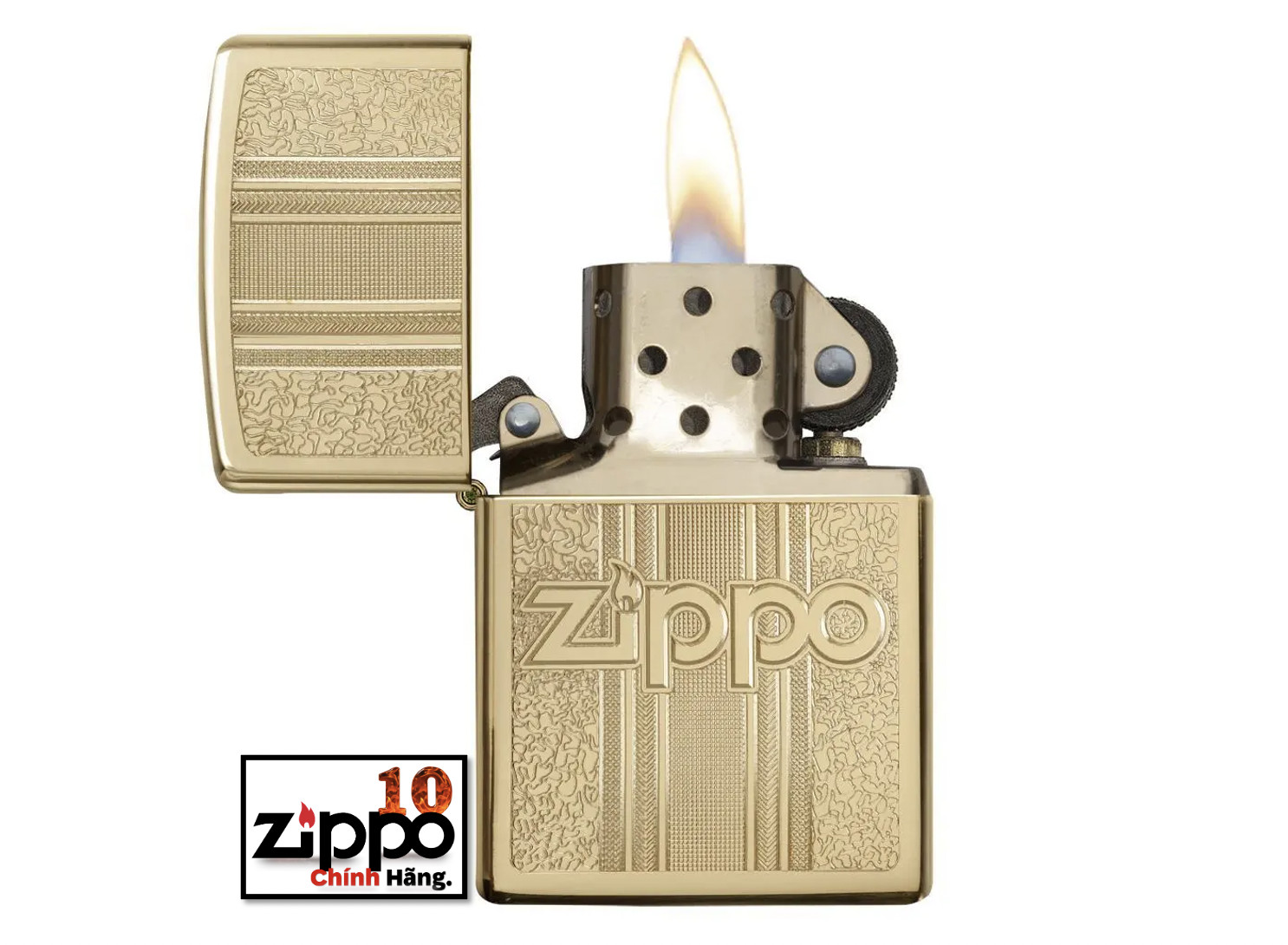 Bật lửa đồng thau cao cấp này có thiết kế hoa văn trang trí được khắc xung quanh logo Zippo.
