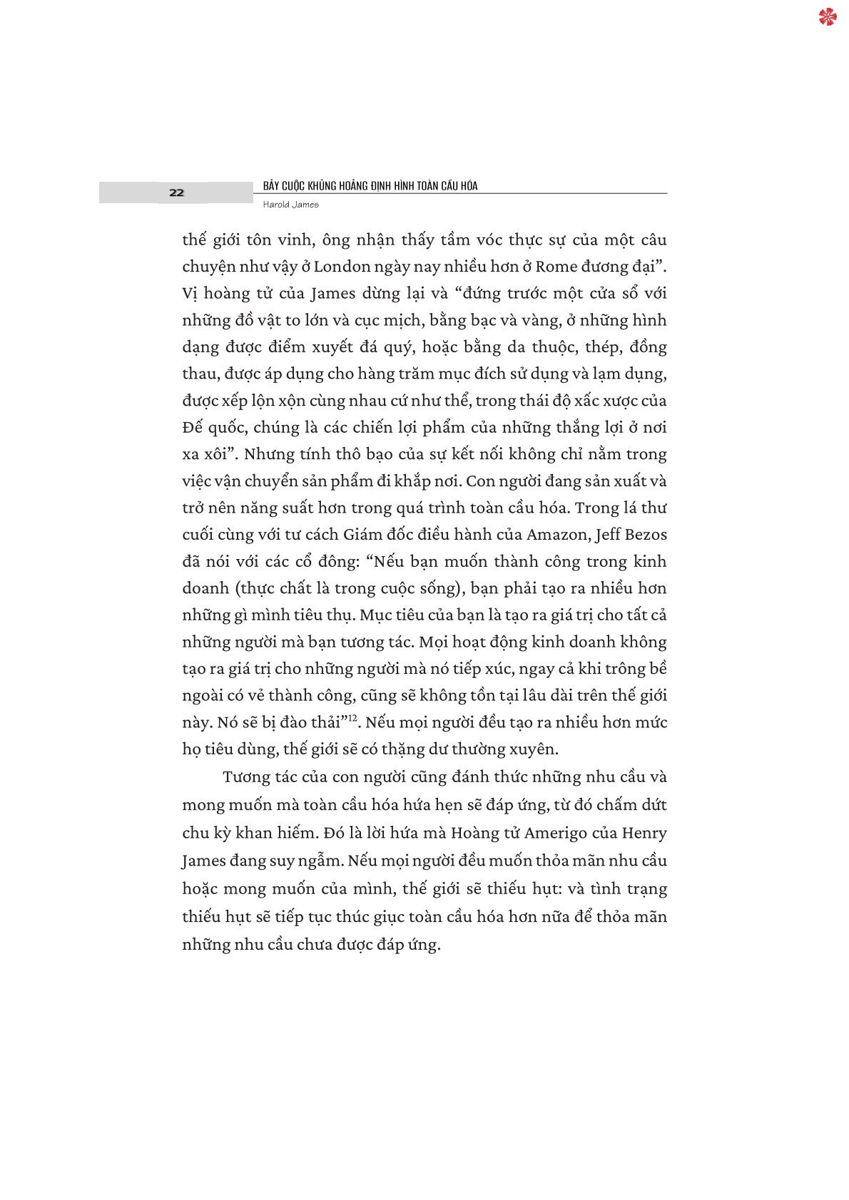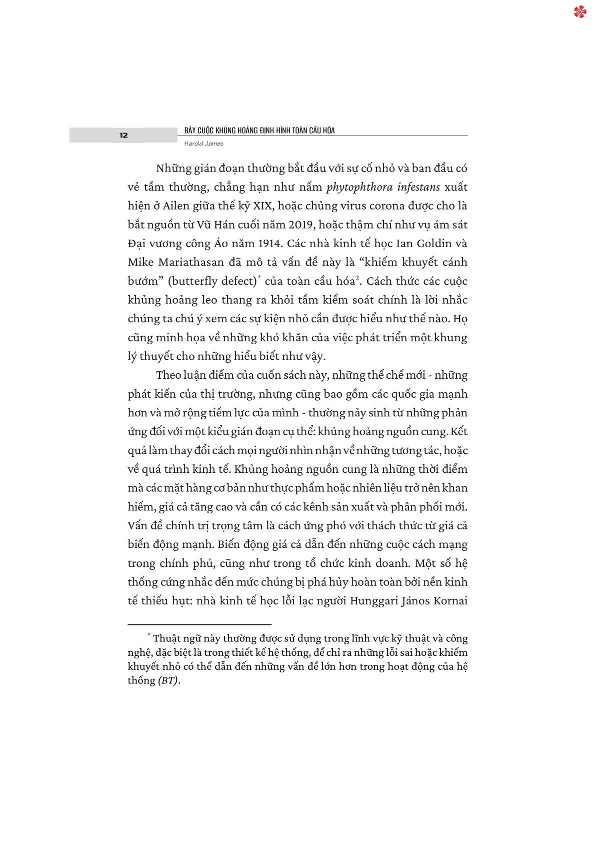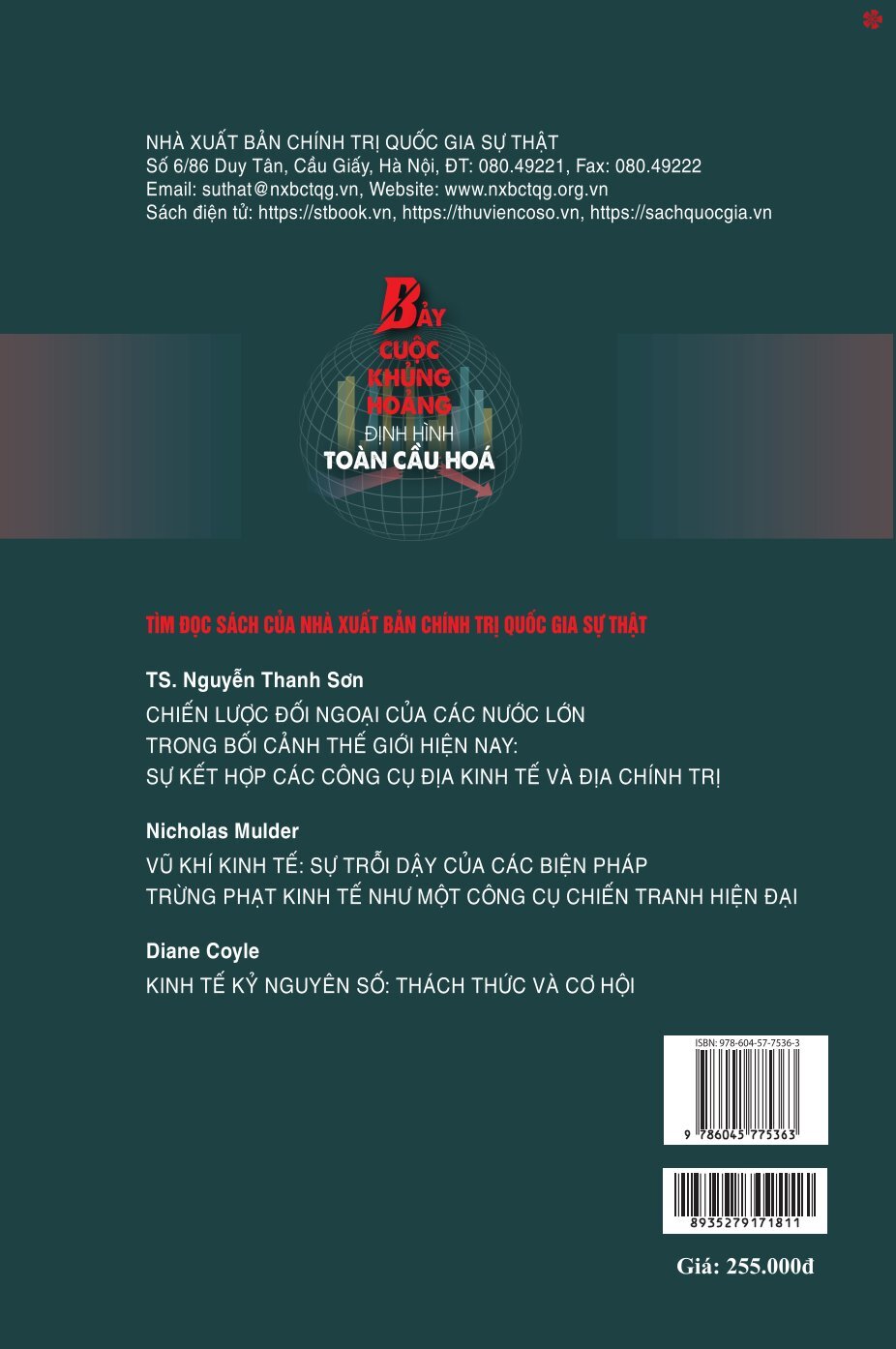 Trên cơ sở khung lý thuyết khái quát nói trên, Giáo sư nổi tiếng người Mỹ Harold James - chuyên gia hàng đầu trong nghiên cứu về Lịch sử kinh tế và quan hệ quốc tế đã phân tích một số cuộc khủng hoảng toàn cầu trong lịch sử cận hiện đại thông qua cuốn sách Bảy cuộc khủng hoảng định hình toàn cầu hóa của ông. Được bố cục thành 7 chương, nội dung sách xem xét một số cuộc khủng hoảng lớn trên thế giới từ thế kỷ XIX đến nay, trong đó có “BẢY CUỘC KHỦNG HOẢNG ĐỊNH HÌNH TOÀN CẦU HÓA’’ Harold James khủng hoảng cuối thập niên 1840, các cú sốc cung - cầu đồng thời trên thị trường chứng khoán năm 1873, thời kỳ Đại suy thoái 1929-1933, cuộc khủng hoảng tài chính toàn cầu 2007-2008 và gần đây nhất là cuộc khủng hoảng Covid-19.