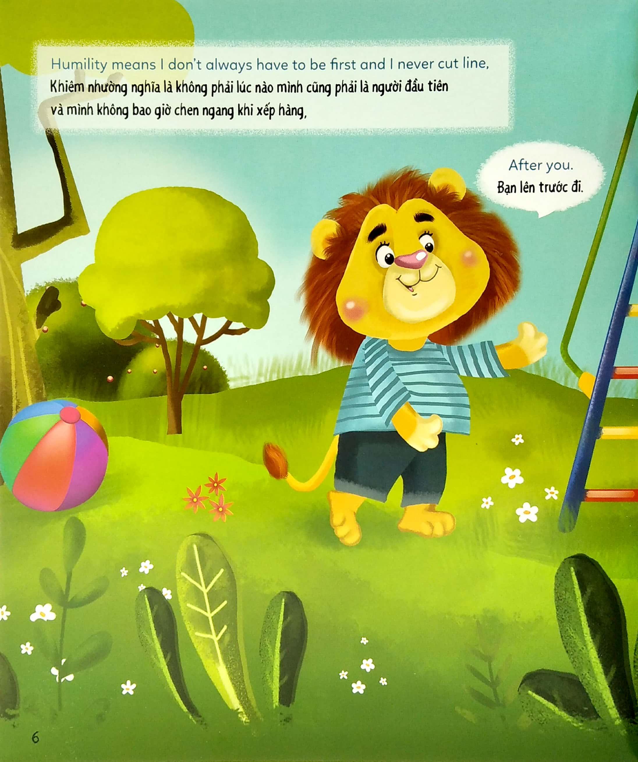 Bạn Rùa kiên trì – kiên trì nghĩa là mình vẫn tiếp tục cố gắng, dù mọi thứ thật khó khăn. Bạn Mèo biết ơn – biết ơn nghĩa là mình cảm ơn vì những gì mình có và mình tìm cách để thể hiện lòng biết ơn đó. Bạn Hưu cao cổ Tinh thần Trách nhiệm - tinh thần trách nhiệm nghĩa là mình làm những việc cần được làm. Bạn Khỉ Tử tế - Tử tế nghĩa là mình vui vẻ sẻ chia hoặc cho người khác những gì mình có. Bạn Gấu Trung thực – Trung thực nghĩa là luôn luôn nói sự thật và chỉ nói sự thật mà thôi…