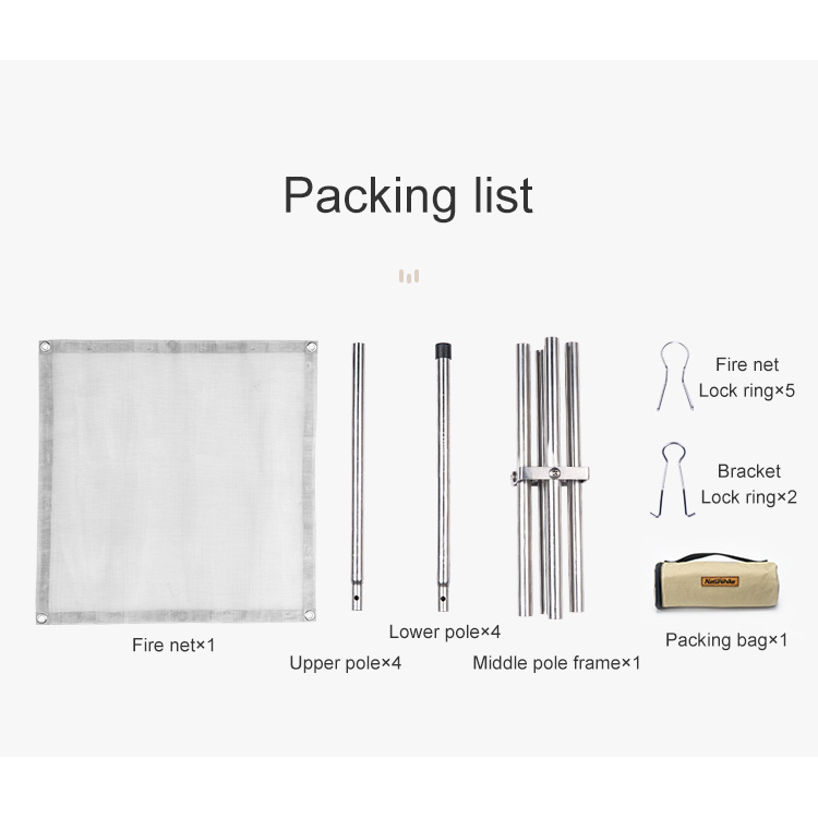 - THÔNG TIN SẢN PHẨM: - Thương hiệu: NatureHike - Mã sản phẩm: NH20SK001 - Chất liệu: Thép Không Gỉ 304, túi đựng vải Oxford - Kích thước sử dụng: 41.5x41.5x26.5cm - Kích Thước đóng gói: φ10x23.5cm - Trọng lượng: 0.8kg - Tải trọng: 5kg - Màu sắc: Bạc - Danh mục phụ kiện: Lưới lửa x1 / Thanh trên x4 / Thanh dưới x4 / Khung thanh giữa x1 / Túi đóng gói x1 / Vòng khóa lưới x5 / Vòng khóa khung x2 - Xuất xứ: Trung Quốc