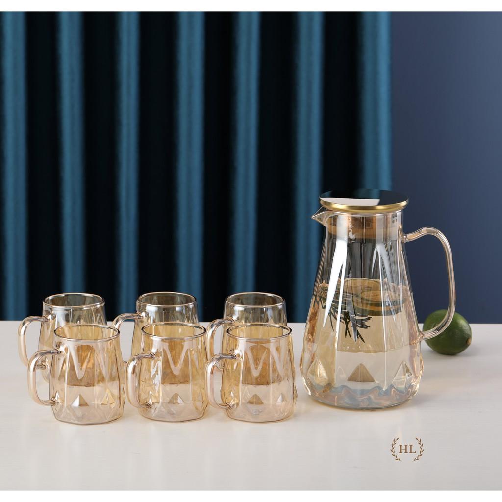 Bộ sp thủy tinh Vân nhân tay cầm màu vàng 1 bình thủy tinh 6 cốc coa tay cầm dễ sử dụng