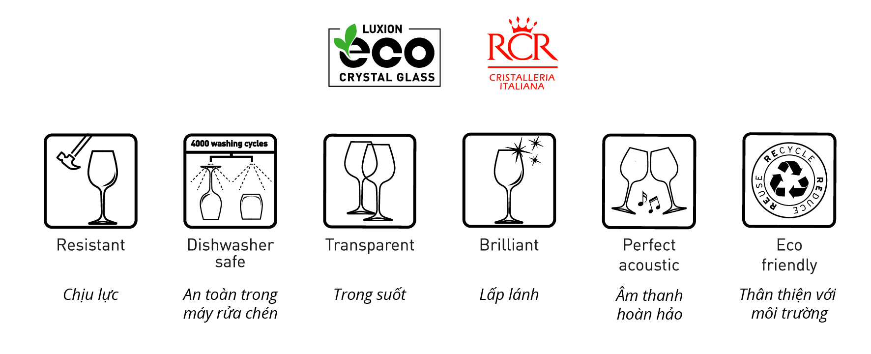 VÌ SAO NÊN CHỌN RCR: LUXION Eco là dòng sản phẩm chất lượng cao và thân thiện với môi trường Có kinh nghiệm lâu năm trong ngành sản xuất thủy tinh Đảm bảo an toàn tuyệt đối cho người sử dụng ,tốt cho sức khỏe Áp dụng các công nghệ kỹ thuật tiên tiến: ép khuôn và thổi Chịu được áp lực và nhiệt độ cao trong máy rửa chén Luôn có sự đổi mới đến từ các nhà thiết kế trên toàn thế giới Có thương hiệu và nổi tiếng trên toàn Thế Giới