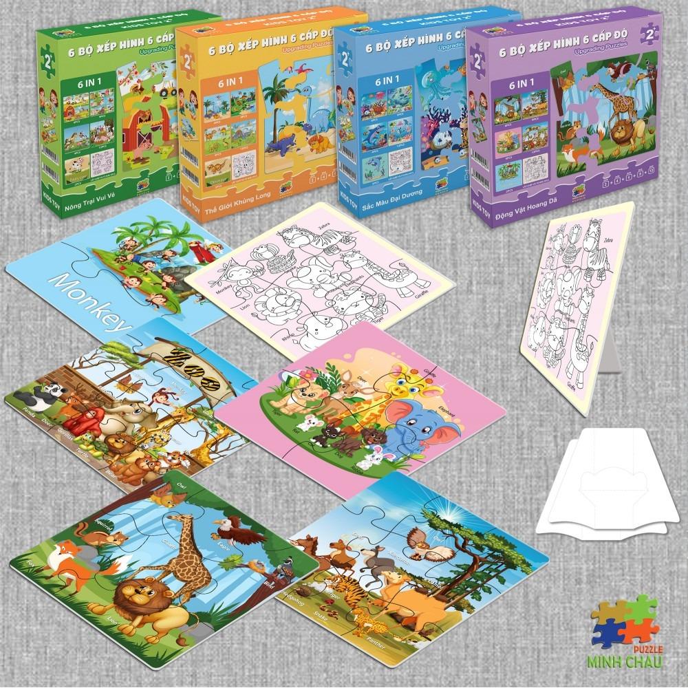 Bộ sưu tập 06 Bộ Tranh Xếp Hình 6 Cấp Độ 17x17cm của Minh Châu, chủ đề Thế Giới Khủng Long gồm 6 mẫu tranh đẹp, sắc nét và có kèm chân đế để bàn tiện dụng.
