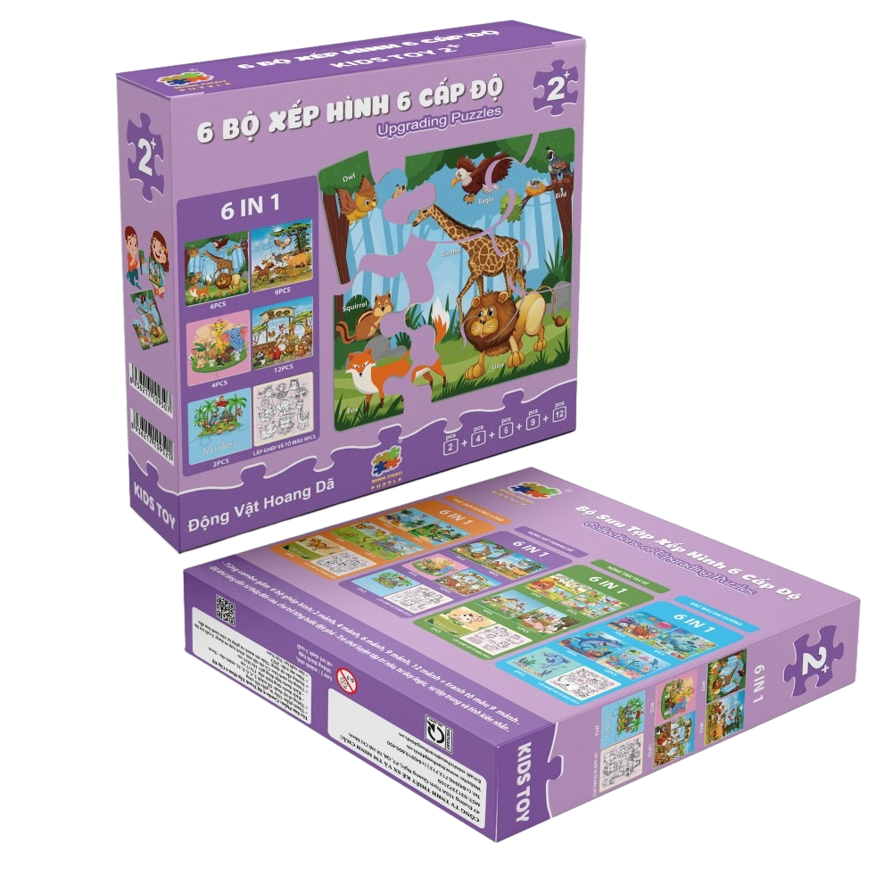 Tranh có độ khó tăng dần: 2 mảnh, 4 mảnh, 6 mảnh, 9 mảnh, 12 mảnh và tranh tô màu 9 mảnh, giúp bé từng bước phát triển tư duy. Trong hộp có 2 chân đế để bàn tiện dụng cho bé trang trí tác phẩm của m.ình.