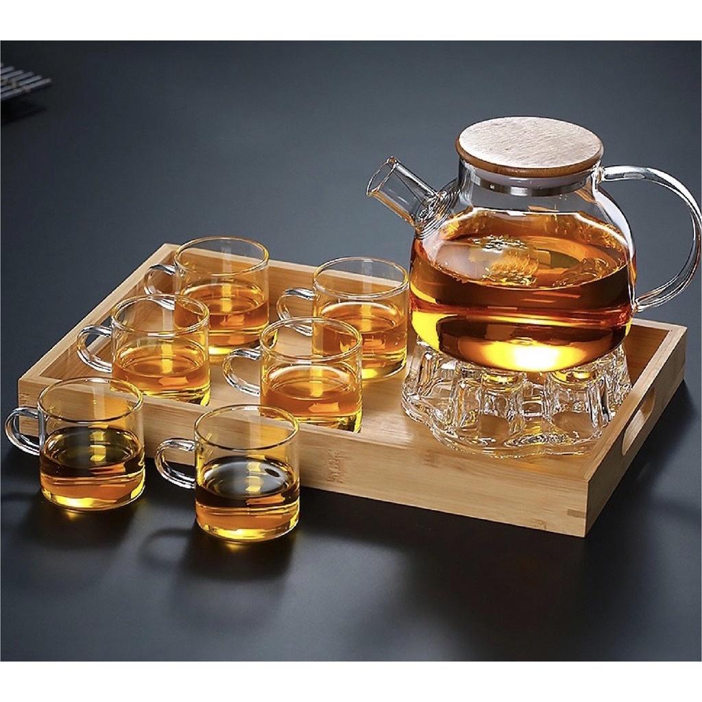 Bộ ấm trà thủy tinh 6 chén kèm đế nến châm trà chịu nhiệt dung tích 1000m