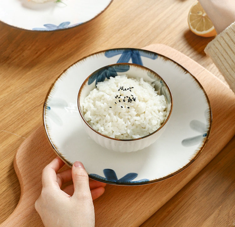 Chất liệu gốm sứ tráng men cao cấp, không chứa chì, không độc hại, thân thiện với môi trường, mẫu trắng cổ điển pha chút hoa xanh viền nâu hiện đại phù hợp với hầu hết các gia đình hiện nay, dễ dàng mua thêm mà không cần thay mới cả bộ bát đĩa đang có.