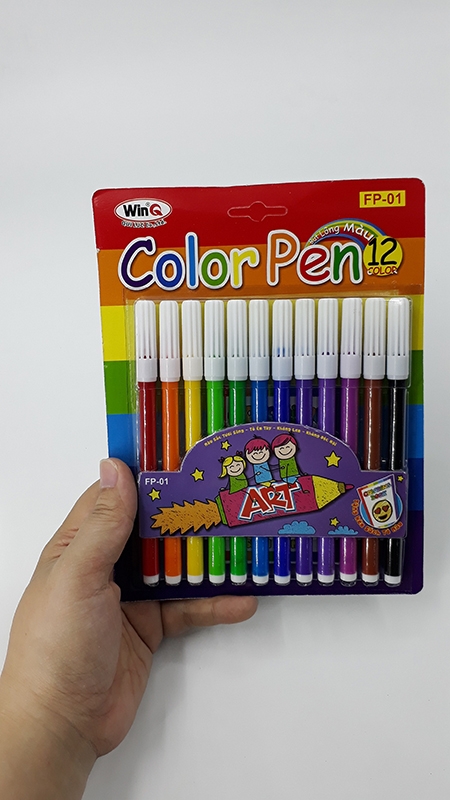 Dạng bút lông tô màu, 12 màu bút được đựng trong vĩ. Màu sắc tươi sáng, rõ nét Đóng gói: 240 vỉ/thùng carton. Lợi ích: Đầu bút bền, độ kín hơi cao, không độc hại