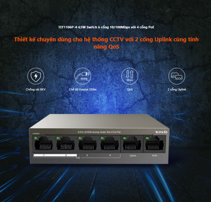 - TEF1106P-4-63W là switch PoE unmanaged với 2 cổng uplink, được thiết kế riêng bởi Tenda - Tương thích với PoE chuẩn IEEE 802.3at/af , tự động phát hiện các thiết bị sử dụng PoE