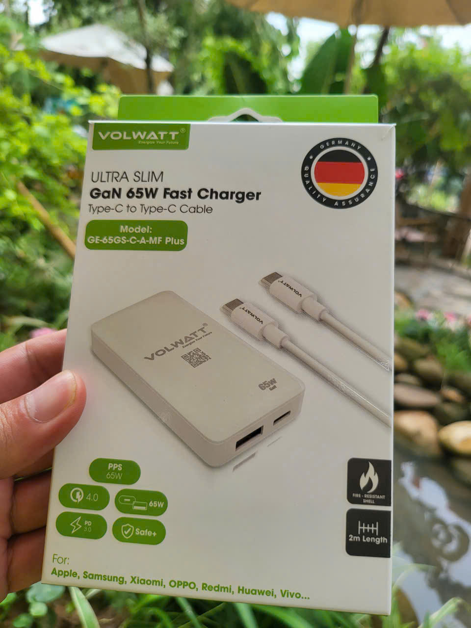 - Tương thích rộng: Sản phẩm sạc cho các loại điện thoại, máy tính bảng hiện nay. Thông số kỹ thuật Thông số Chi tiết Model GE-65GS-C-A-MF Công suất sạc 65W Chuẩn sạc PD 3.0 Công nghệ GaN Pro+ (Gallium Nitride) Cáp sạc đi kèm Có 2 lựa chọn, một loại kèm cáp 100W Type-C to Type-C , một loại không kèm cáp Kích thước Nhỏ gọn, tiện lợi Bảo vệ an toàn Chống quá tải, chống quá nhiệt, chống đoản mạch, bảo vệ chống nhiễu điện từ, bảo vệ điện áp thấp, bảo vệ tĩnh điện, bảo vệ quá dòng Tương thích Các loại sản phẩm điện thoại, máy tính bảng Chứng nhận CE, FCC, RoHS Màu sắc Trắng Phân phối bởi Volwatt GmbH, Đức Bảo hành 24 tháng Đừng bỏ lỡ cơ hội nâng cấp trải nghiệm sạc của bạn với Volwatt GaN 65W Fast Charger. Với thiết kế hiện đại, hiệu suất vượt trội và tính năng bảo vệ an toàn, sản phẩm này chắc chắn sẽ là người bạn đồng hành lý tưởng cho mọi thiết bị di động của bạn. Hãy đặt hàng ngay hôm nay để trải nghiệm sự khác biệt và đột phá mà Volwatt mang lại. Hãy để Volwatt mang đến cho bạn sức mạnh của công nghệ và sự yên tâm tuyệt đối trong từng lần sạc.