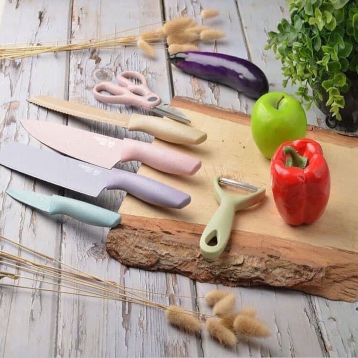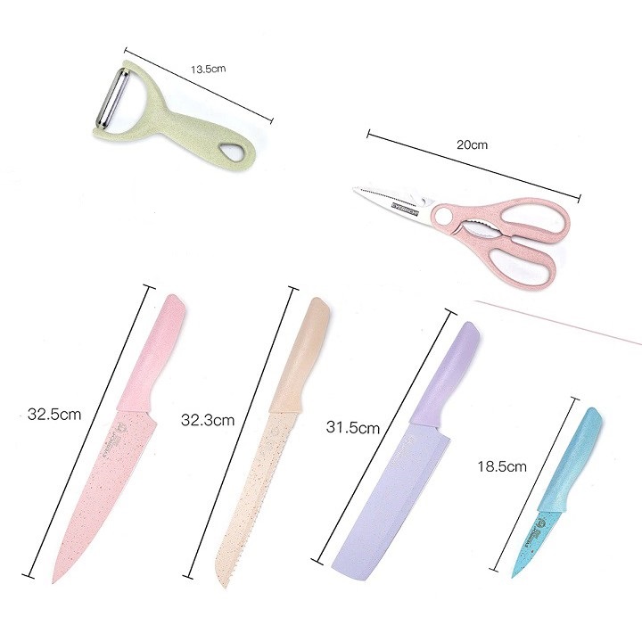 Bộ dao gồm 6 món gồm có: 01 dao bào, 01 kéo, 01 dao gọt hoa quả, 01 dao thái răng cưa, 01 dao thái nhỏ, 01 dao thái to.