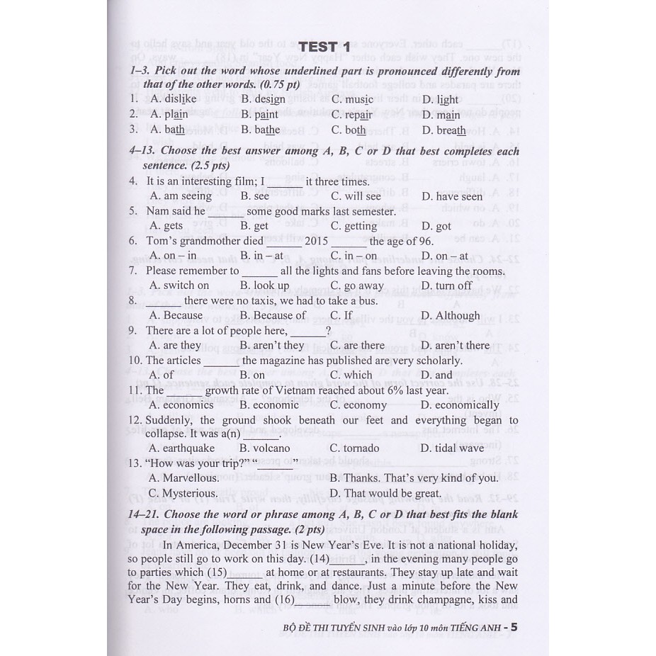Bộ Đề Thi Tuyển Sinh Vào Lớp 10 Môn Tiếng Anh