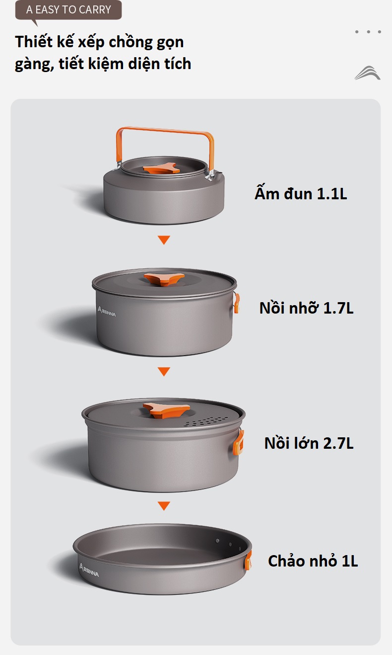 – Đây là bộ nồi được thiết kế cực kỳ gọn, nhẹ. Dễ dàng bỏ vào bất cứ balo nào, chống dính, sẵn sàng cho tất cả các món chiên, canh, xào, và cả nấu cơm. Sản phẩm phù hợp cho các chuyến đi dã ngoại, leo núi,