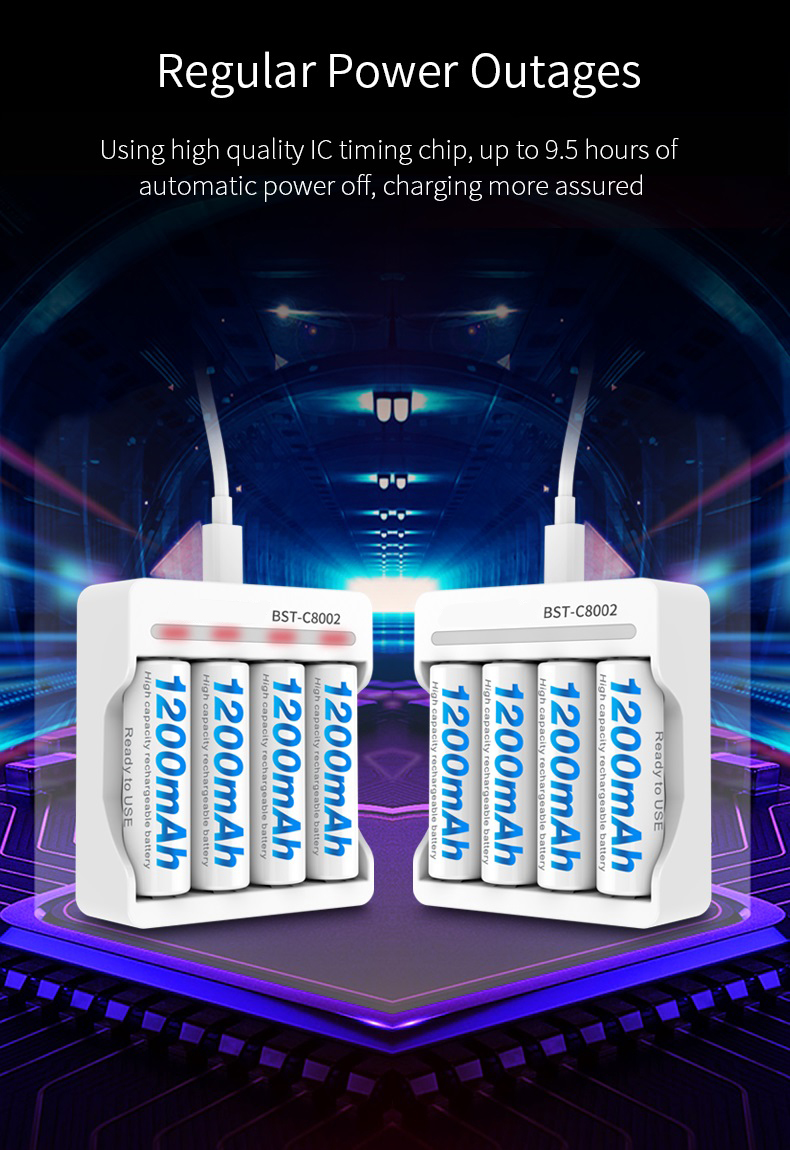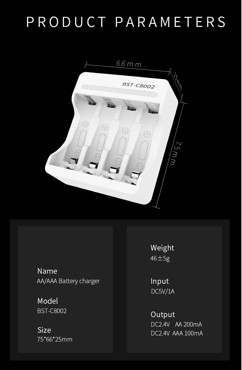 Sạc BST-C8002 : – Dùng được cho các cỡ Pin : AA, AAA. – Dùng cho Pin có thể sạc được; Điện áp 1.2V Ni-Mh/Ni-Cd. – Sạc được đến 4 pin các loại. – Dòng sạc/Viên: Pin AA 150mA; Pin AAA 130mA – Sạc bằng cáp micro USB (có kèm theo) – Sạc không tự ngắt, sạc pin từ 6-8h để đầy pin