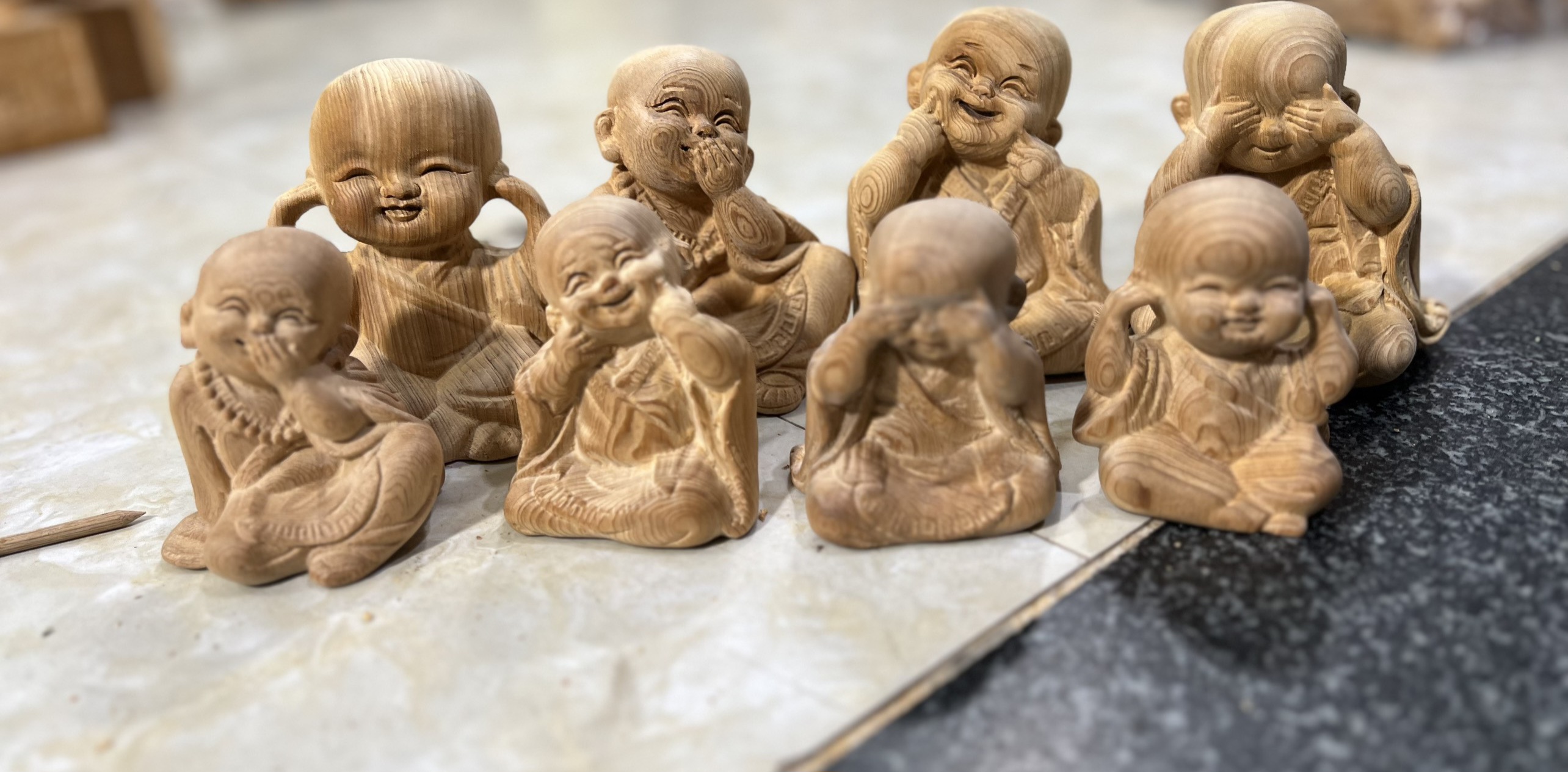 Bộ tượng tứ không được làm bằng chất liệu gỗ ngọc am liền khối tự nhiên 100% Kt cao 12×10×9cm _ Tượng được chạm khắc gọt tỉa vô cùng tỉ mỉ tinh xảo kỳ công. Đi hầu hết tất mọi chi tiết góc ngách nội dung hoa văn của tượng đều được gọt tỉa chỉnh sửa sắc nét hoàn toàn bằng tay thủ công. TƯỢNG CHẾ TÁC LÀM VÀ HOÀN THIỆN TỪ BÀN TAY KHỐI ÓC TÀI HOA VÀ NHỮNG NGƯỜI THO GIÀU KINH NGHIỆM CŨNG NHƯ TAY NGHỄ CAO TRONG LÀNG NGHỄ TRUYỀN THỐNG