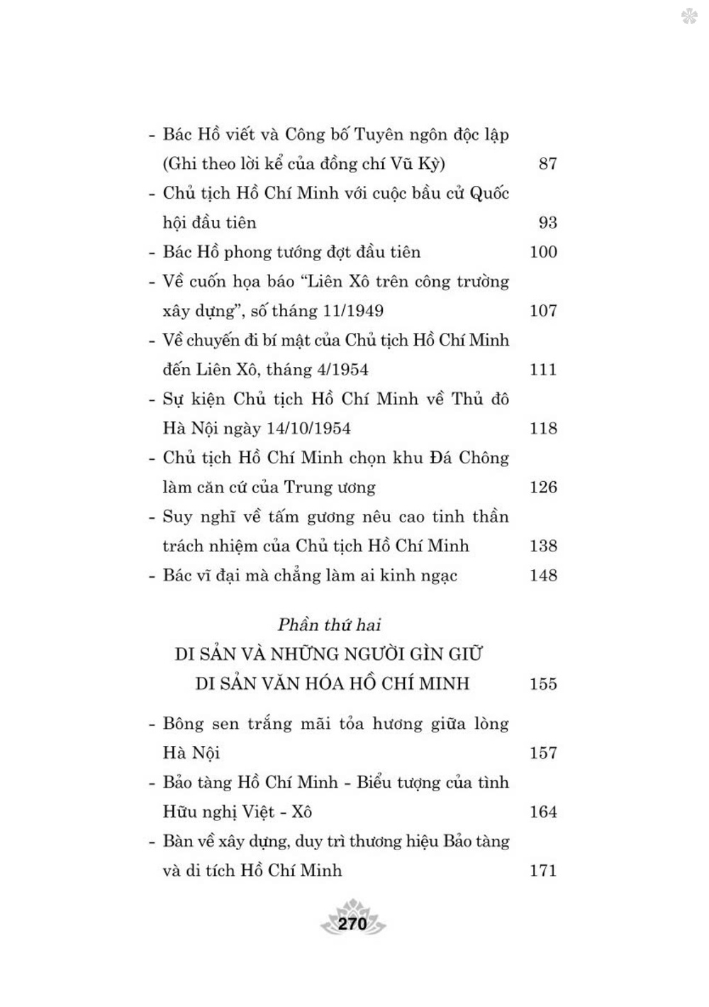 Cuốn sách tập hợp những bài viết tâm huyết của TS. Chu Đức Tính - nguyên Giám đốc Bảo tàng Hồ Chí Minh - về quá trình hoạt động cách mạng của Chủ tịch Hồ Chí Minh, đồng thời giới thiệu về những nơi, những con người thầm lặng đã có công lao trong việc gìn giữ những di sản về Chủ tịch Hồ Chí Minh, trong đó, Bảo tàng Hồ Chí Minh chính là cơ quan giữ vai trò quan trọng nhất trong công tác này.