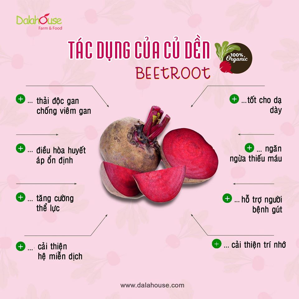Sản phẩm nguyên chất 100% từ củ dền tươi, không chất bảo quản, không chất phụ gia. Sản phẩm tan trong nước rất tiện lợi khi sử dụng. Với màu đỏ đẹp mắt, bột củ dền đã được xem như một liệu pháp tạo màu tự nhiên cho các món ăn Được sử dụng như một loại sản phẩm dưỡng da mặt giúp làm sáng da, dưỡng ẩm, trẻ hóa làn da, tẩy tế bào chết, làm mịn da và làm mềm môi Bột củ dền làm bột ăn dặm cho bé giúp bé ăn ngon miệng hơn Là thực phẩm bổ dưỡng cho người lớn tuổi Thanh lọc cơ thể, ngăn ngừa ung thư hỗtrợđiềutrị thiếu máu Nguyên chất 100% củ dền tươi Đạt chứng nhận ISO, FDA Hoa Kỳ Bột củ dền nguyên chất Dalahouse Bột củ dền được sấy lạnh với công nghệ tiên tiến nhất, giữ nguyên được hương vị Bột củ dền nguyên chất , không chất bảo quản, đảm bảo an toàn thực phẩm.