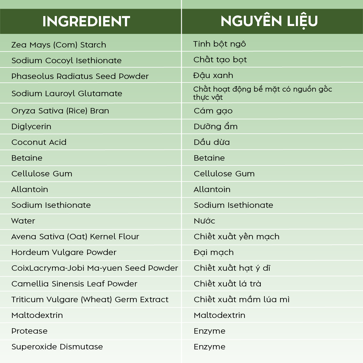 ● Ngũ cốc chiết xuất từ thiên nhiên (lúa mạch, ngô, mầm lúa mì, yến mạch, cám gạo, ý dĩ, đậu xanh): làm sạch, loại bỏ tế bào ch ết dạng vật lý, làm mềm mịn, dưỡng ẩm, dưỡng sáng da