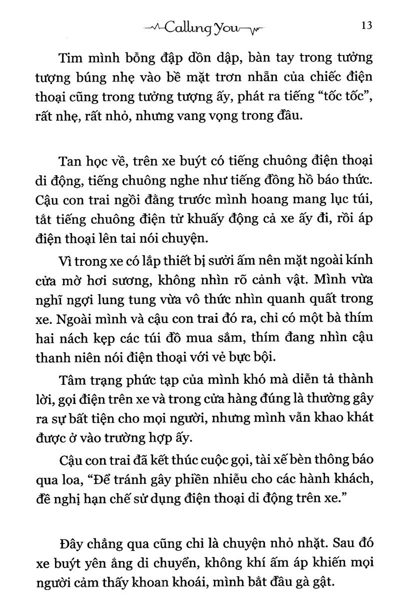 Truyện thứ nhất Calling You, cũng là truyện chủ đề, kể về một thiếu nữ mặt mụn, tự ti và cô độc. Sống trong lòng một xã hội có công nghệ hiện đại bậc nhất, ở thời buổi thông tin liên lạc mạnh mẽ nhất, cô lại thiếu đi một vật dụng vô cùng thiết thân là chiếc điện thoại. Cô bèn tự khuây khỏa bằng cách tưởng tượng lấy một chiếc trong đầu, màu trắng, nhỏ xinh, có vân lượn sóng. Cô nghĩ về nó, thiết tha miên man đến nỗi có lẽ năng lượng vũ trụ cũng cảm nhận được và khiến nó hoạt động, nên một ngày kia, chiếc điện thoại trong đầu bất thần reo chuông. Khi đường dây thông, một giọng nam vọng đến…
