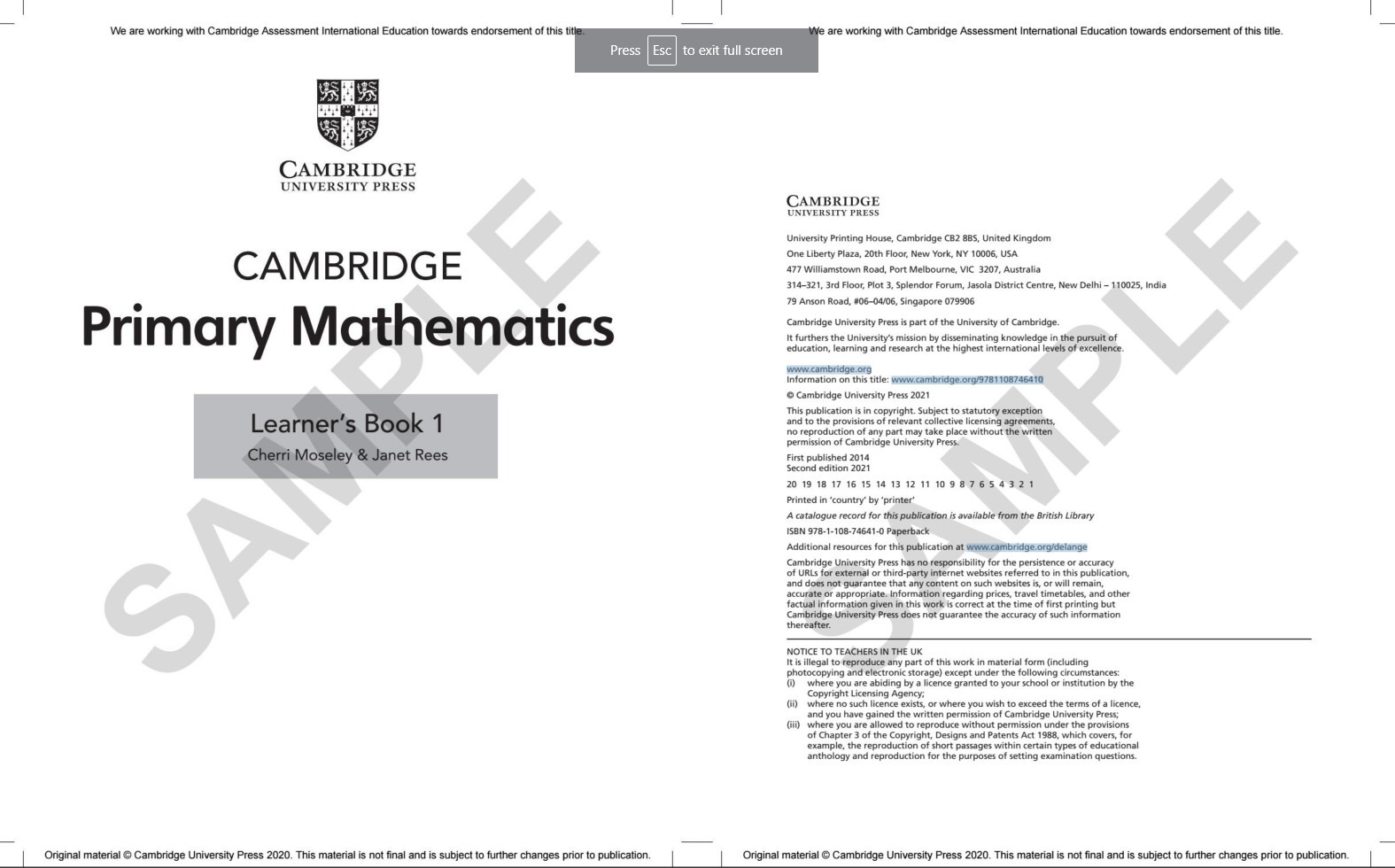 Discover our new resources for the Cambridge International Primary and Lower Secondary Curriculum Frameworks. Whether they are learning about numbers with dominoes or using 3D shapes to create a house, Cambridge Primary Mathematics helps your learners develop their mathematical thinking skills. They'll be fully supported with worked examples and plenty of practice exercises, while projects throughout the book provide opportunities for deeper investigation of mathematical concepts – including making their own snakes to develop comparison skills. With key word boxes, clear diagrams and supporting illustrations, the course makes maths accessible for second language learners.